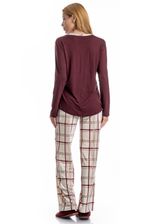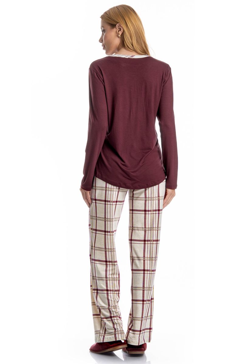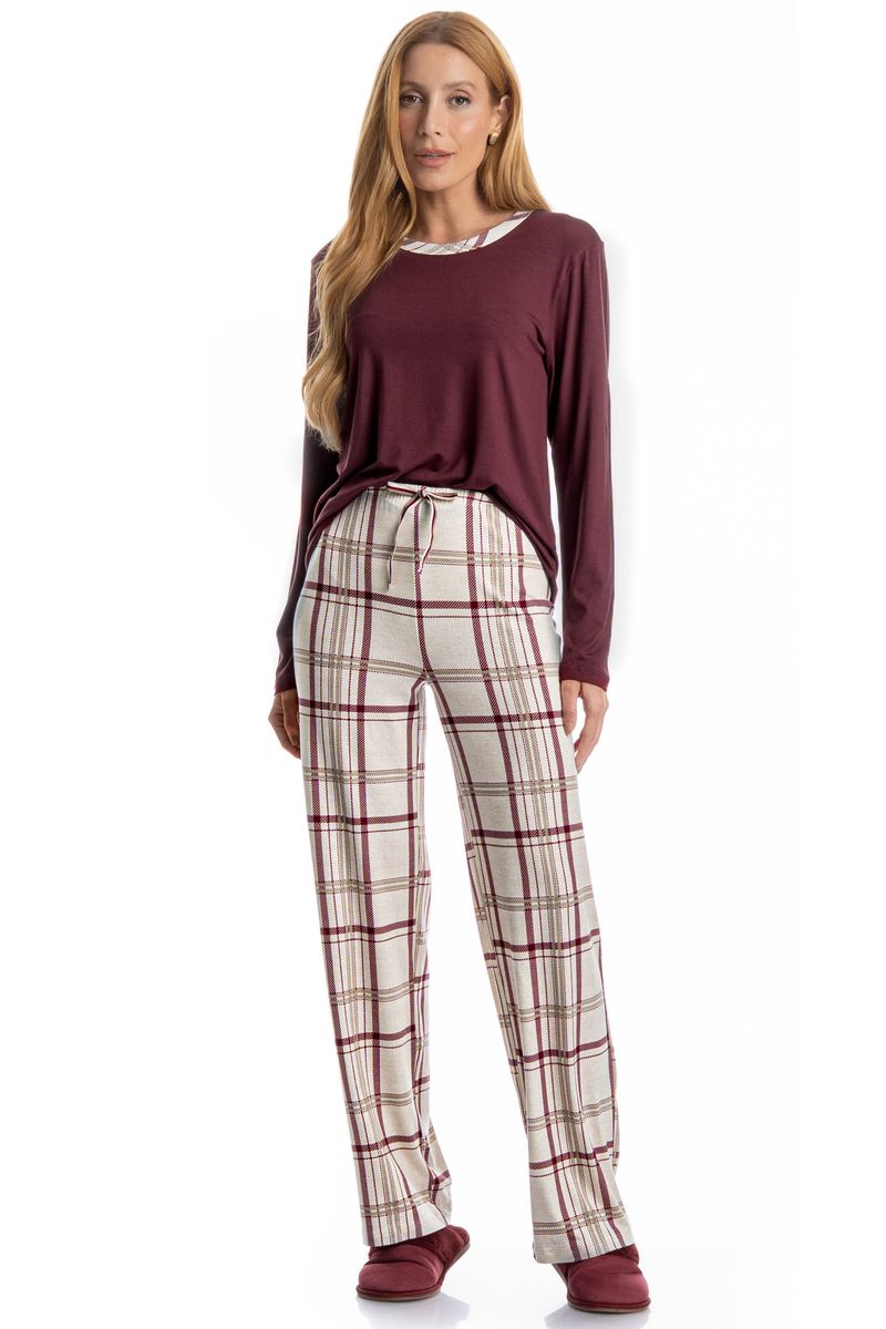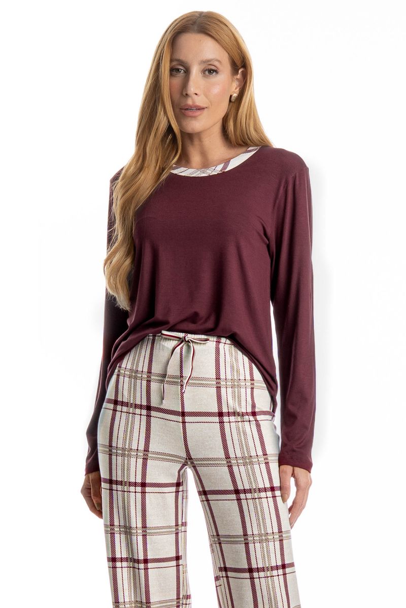 Pijama Feminino Longo Jaque é excelente para suas noites frias! A blusa possui uma modelagem confortável, em manga longa com decote redondo e trançador de tom contrastante. Sua calça é toda estampada em um moderno e exclusivo xadrez, detalhe para seu falso amarre aplicado no centro do cós. Muito estilo e conforto para estar com você nos melhores momentos!