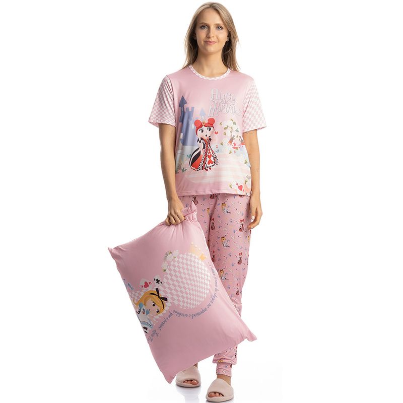 Pijama Feminino Longo Manga Curta Alice é conforto para suas noites! Sua blusa em modelagem ampla e confortável, possui manga curta e decote redondo, detalhe para sua divertida e exclusiva estampa localizada desenhada à mão da Alice no país das maravilhas. Sua calça com punho também muito confortável, possui cós com elástico macio para um melhor descanso. Perfeito para te acompanhar durante os melhores momentos!