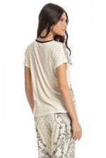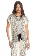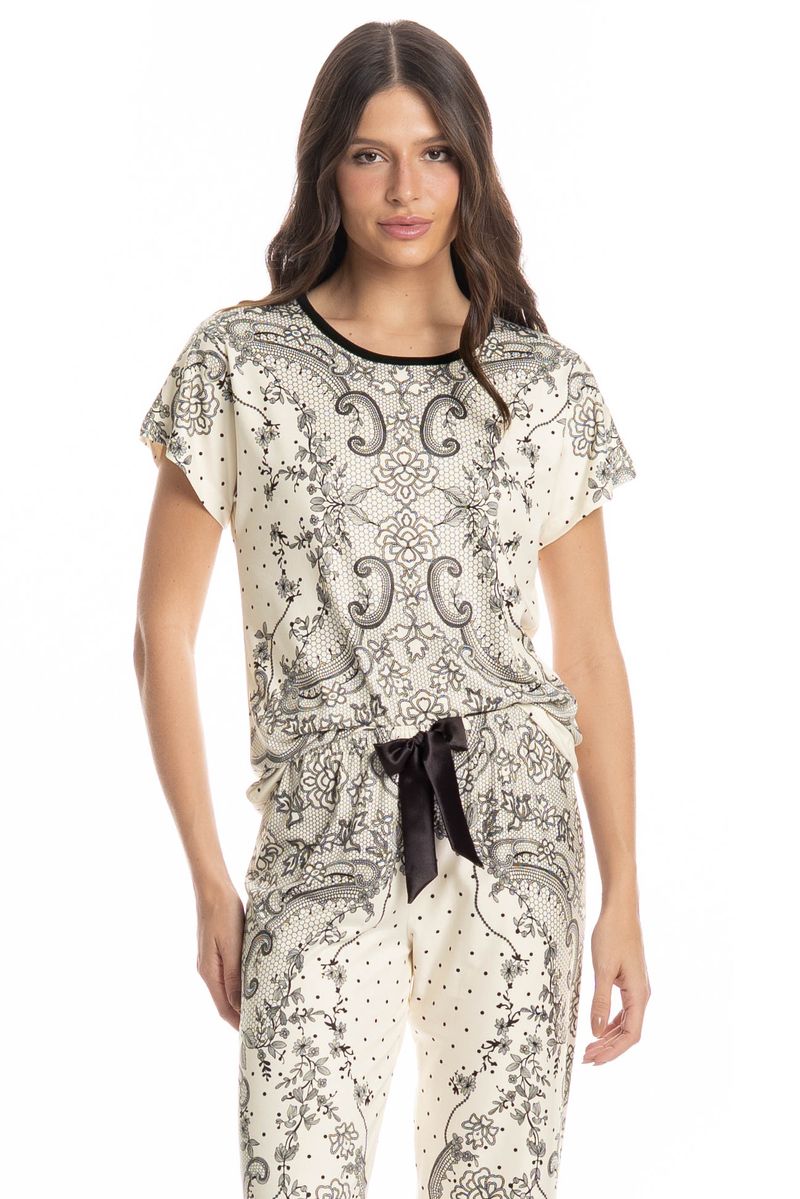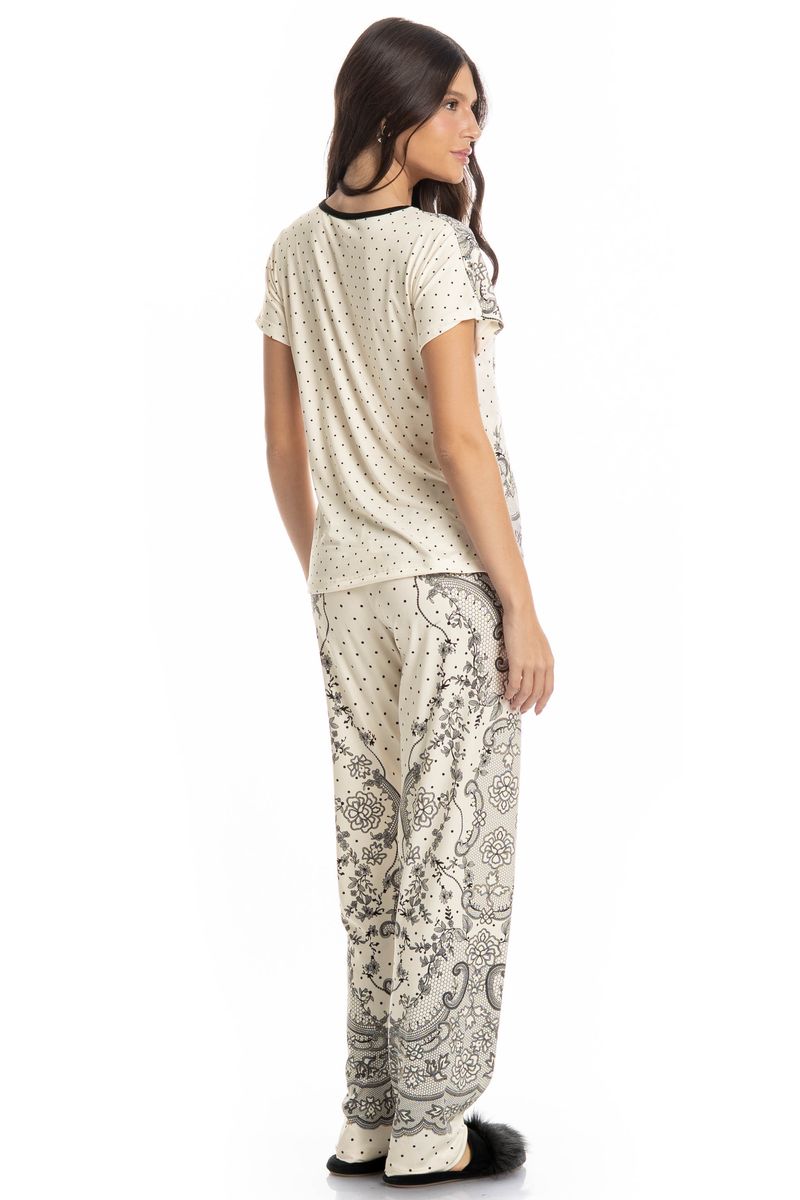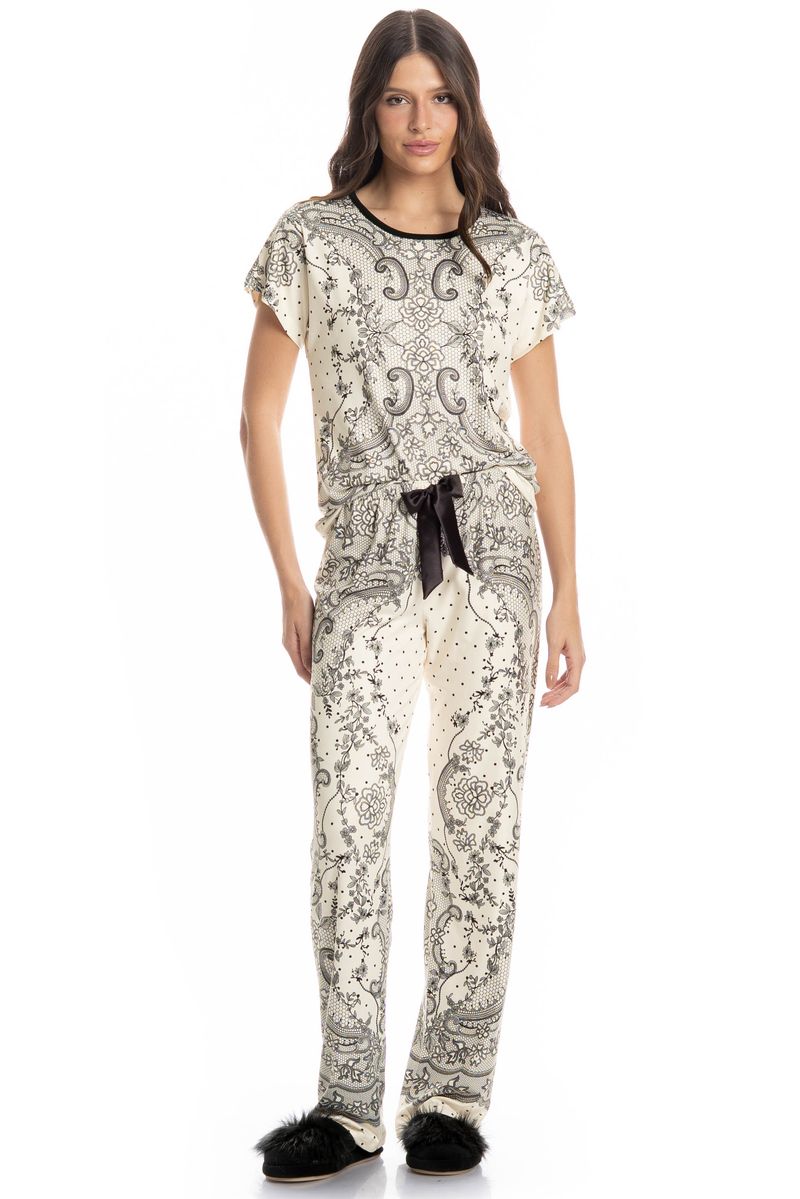 Pijama Feminino Longo Manga Curta Chiara é perfeito para seus momentos de descanso! Sua blusa possui mangas curta e decote redondo com acabamento em viés. Sua calça em modelagem ampla conta com elástico macio e confortável no cós. Detalhe para sua exclusiva estampa que confere muita sofisticação a peça!