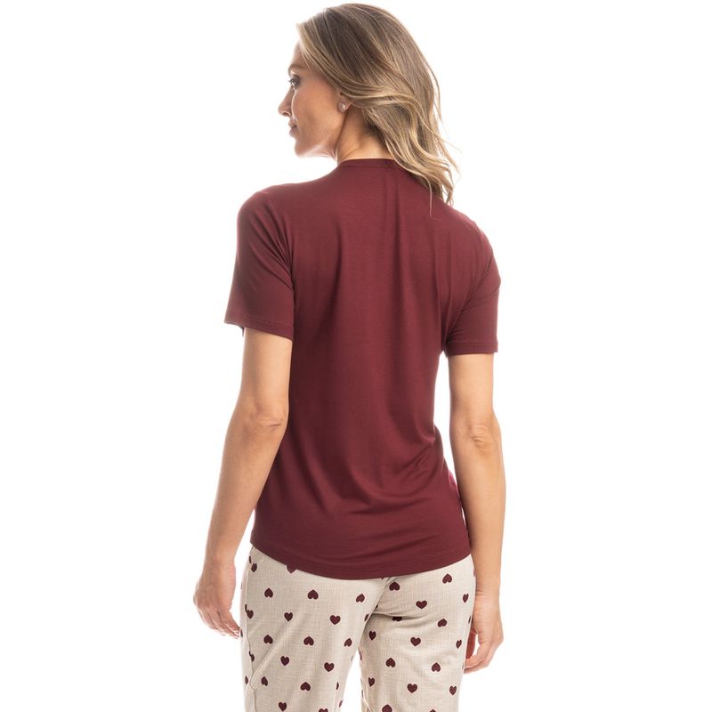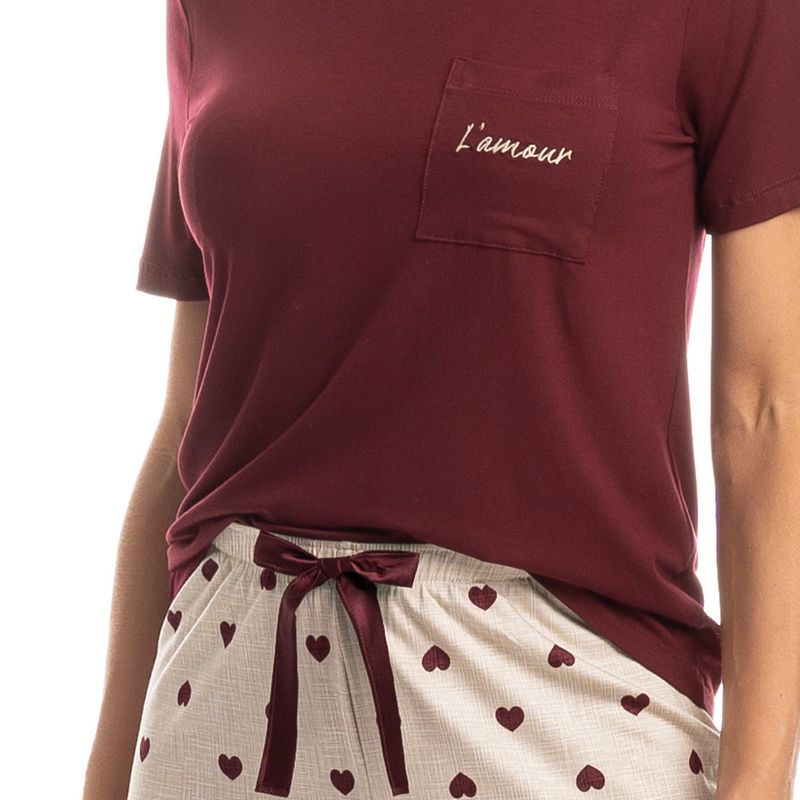 Pijama Feminino Longo Manga Curta Lile é puro charme! Em modelagem muito confortável, sua blusa lisa em manga curta possui decote redondo com aplicação de viés, e bolso com delicado bordado na lateral esquerda. Sua calça com estampa de corações, possui modelagem confortável e como detalhe seu laço de cetim no centro do cós. A escolha perfeita para desfrutar o melhor da estação!