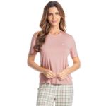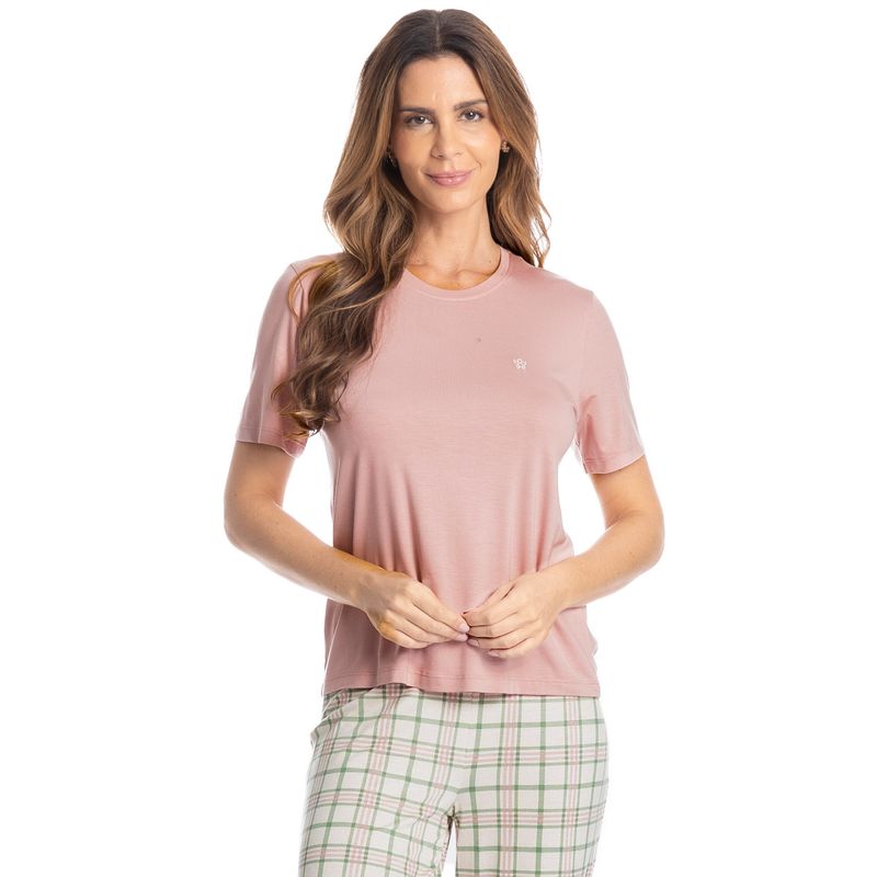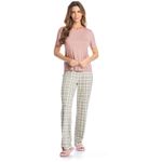 Pijama Feminino Longo Manga Curta Lola é puro charme! Em modelagem muito confortável, sua blusa lisa em manga curta possui decote redondo debruado em viés, e um delicado bordado logo Daniela Tombini na lateral esquerda. Sua calça com estampa xadrez, possui modelagem confortável e elástico macio no cós. A escolha perfeita para desfrutar o melhor da estação!