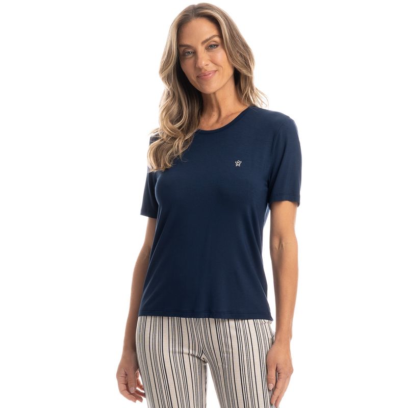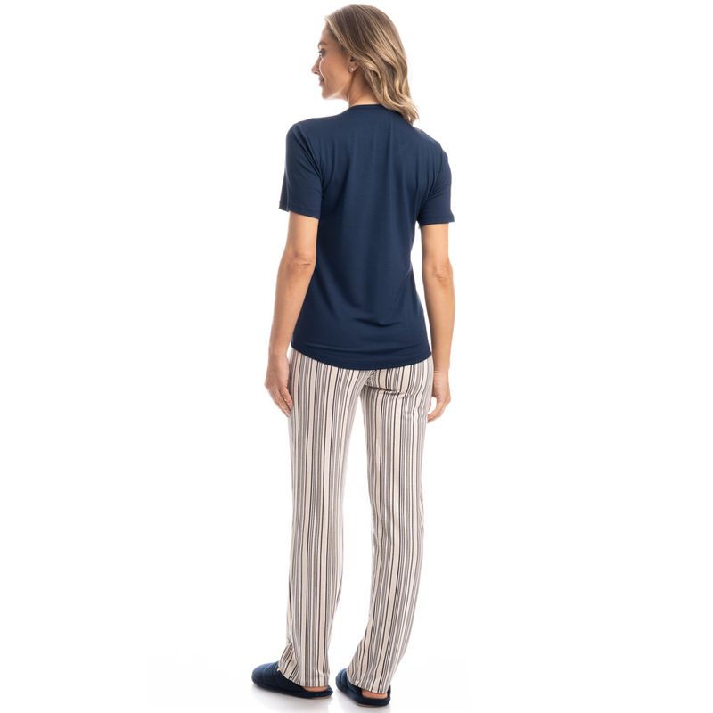 Pijama Feminino Longo Manga Curta Maitê é puro conforto! Em modelagem ampla, com um tecido de toque surpreendente, o pijama Maitê é perfeito para suas noites. Sua blusa manga curta possui decote redondo com acabamentos em viés e um delicado bordado logo Daniela Tombini, garantindo ainda mais charme. Sua calça é listrada e possui elástico macio no cós para melhor descanso! Muito conforto e estilo para seus momentos de descanso!