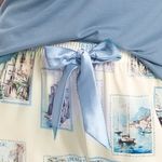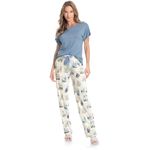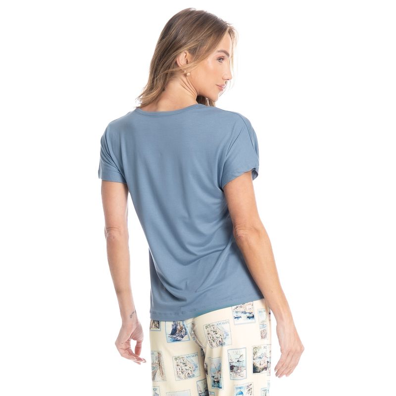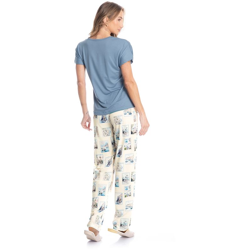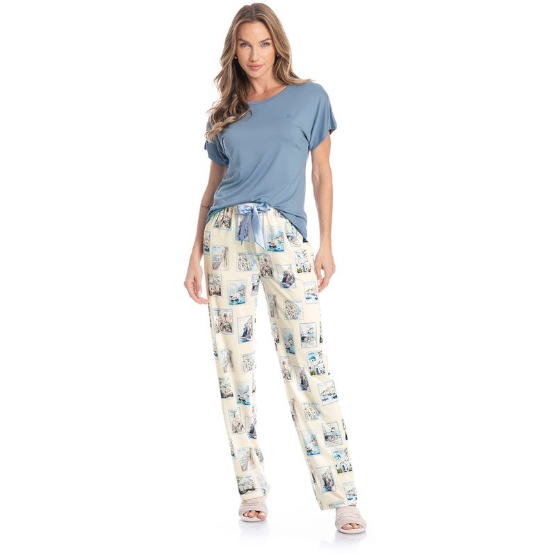 Pijama Feminino Longo Manga Curta Postais é puro charme! Em modelagem muito confortável, sua blusa lisa em manga curta possui decote redondo com aplicação de viés, e um delicado bordado logo Daniela Tombini na lateral esquerda da peça. Sua calça estampada possui modelagem confortável e como detalhe um lindo laço de cetim no centro do cós. A escolha perfeita para desfrutar o melhor da estação!
