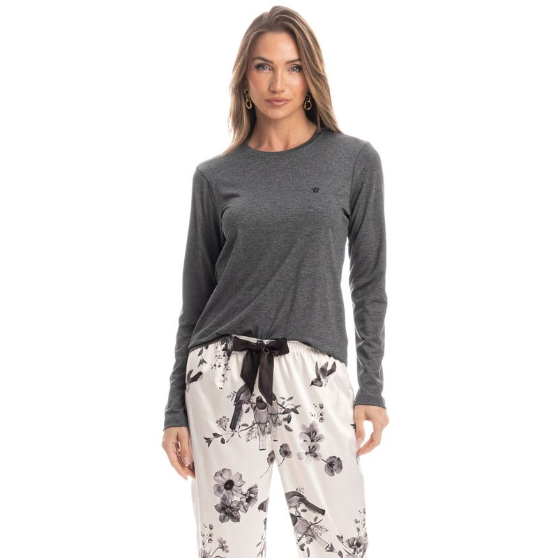 Pijama Feminino Longo Pássaros é puro conforto para todas as horas! Em modelagem ampla e extremamente confortável, sua blusa lisa possui manga longa e decote redondo com acabamento em viés. Detalhe para o bordado logo Daniela Tombini em sua lateral esquerda da peça. Já a sua calça, em modelagem ampla possui um lindo laço de cetim no cós. A peça conta com uma sofisticada e elegante estampada de pássaros. Muito conforto para suas horas de descanso!