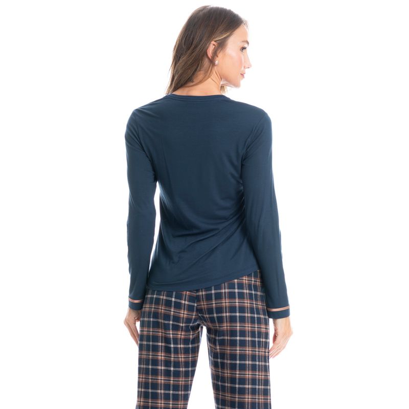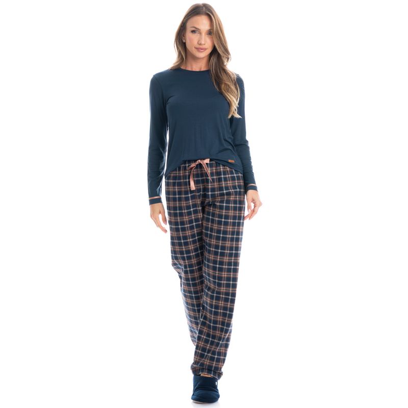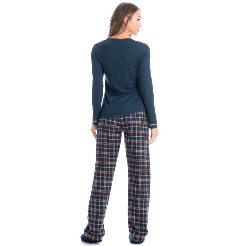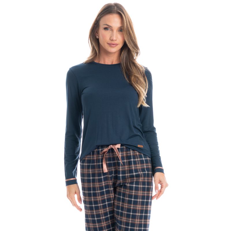 Pijama Feminino Longo Xadrez Cozy é estilo para as suas horas de descanso! A blusa possui modelagem ampla e confortável, possui decote redondo com acabamento em viés, e suas mangas são longas com aplicação de sofisticados filetes de cetim. Detalhe para sua etiqueta de couro na lateral inferior esquerda de peça. Confeccionada em Viscolycra, tecido proveniente da fusão das fibras de elastano e viscose, gerando um tecido leve, confortável e de fácil cuidado.