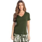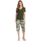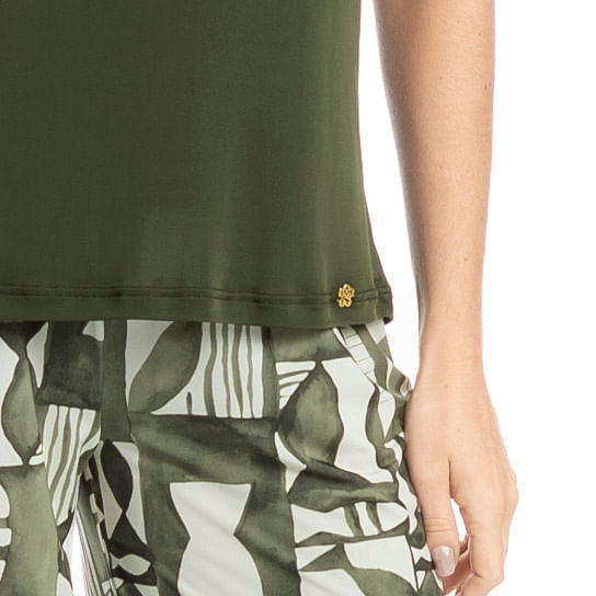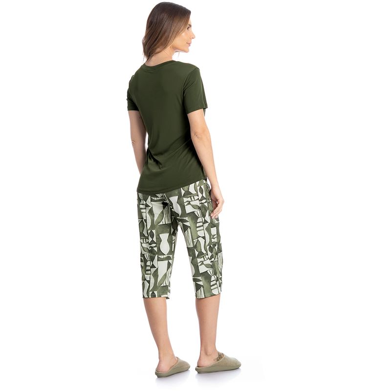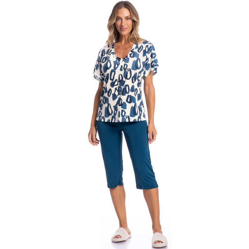 Pijama Feminino Pescador Teresa é puro conforto! Em modelagem ampla e confortável, sua blusa lisa manga curta possui decote com acabamento em gola V. Detalhe para a delicada plaquinha logo Daniela Tombini na lateral inferior esquerda da peça. Já a sua calça estampada em modelagem pescador conta com elástico macio e confortável no cós.
