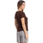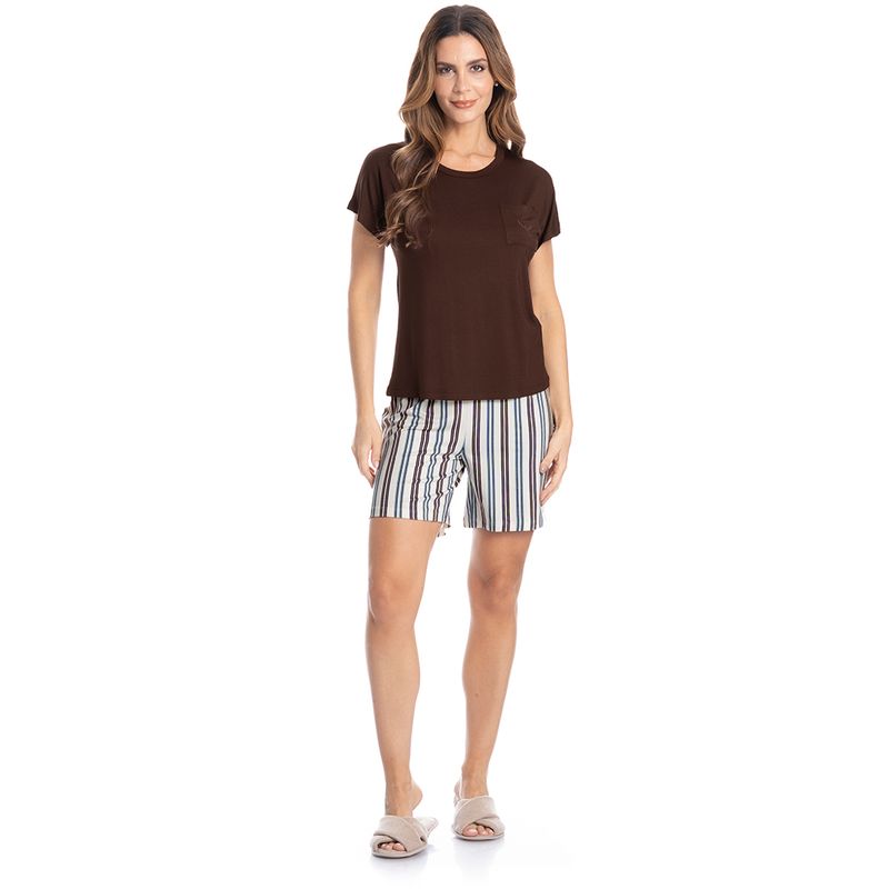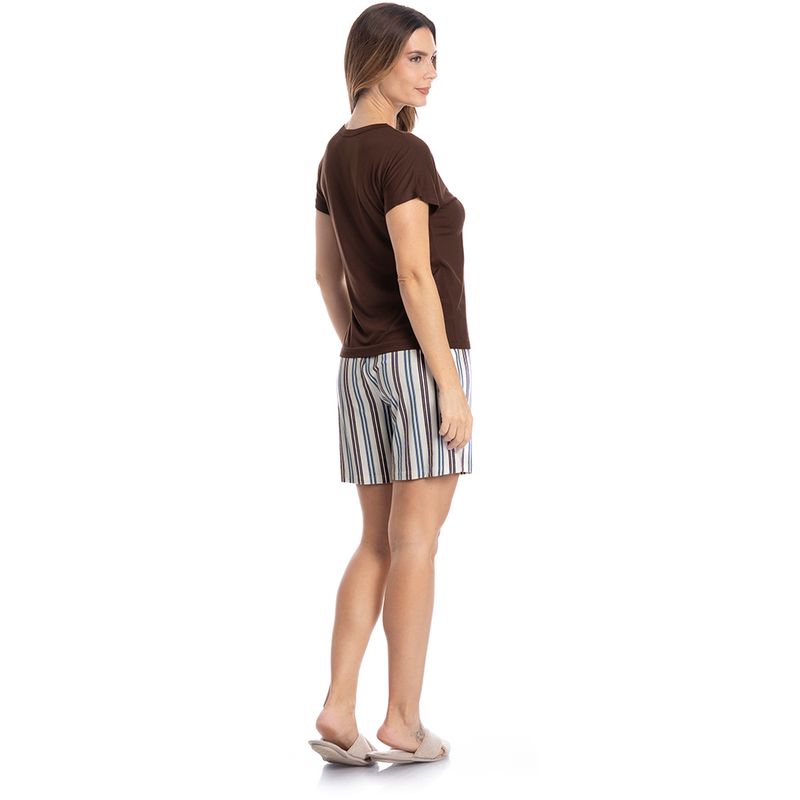 Pijama Feminino Shortão Lia é puro conforto! Sua blusa é lisa com manga curta, possui decote redondo e bolso com um delicado bordado na lateral esquerda da peça. Seu short com uma sofisticada estampa de listras, possui modelagem ampla com elástico macio garantindo muito conforto em seus momentos de descanso. Perfeito para te deixar ainda mais elegante e estilosa em suas noites!