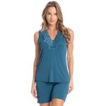 Pijama Feminino Shortão Regata Biba é pura elegância! Em modelagem ampla, com um tecido de toque surpreendente, o pijama Biba é perfeito para seu Verão. Sua blusa regata possui decote com aplicação de uma linda e delicada renda. Detalhe para seu pingente no centro do decote. Seu shorts possui modelagem ampla e elástico macio no cós para melhor descanso!