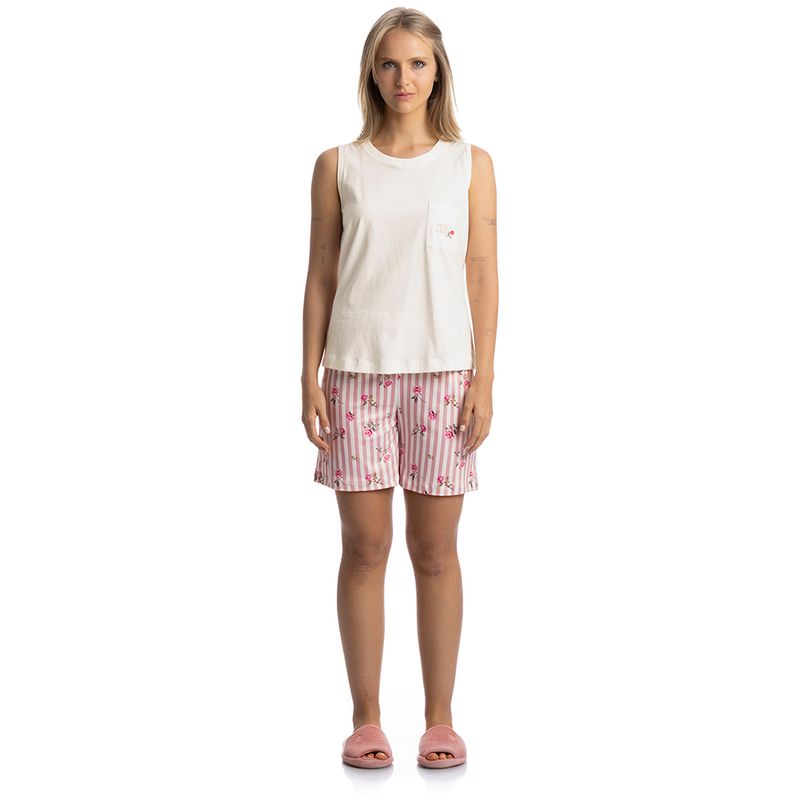 Pijama Feminino Shortão Regata Rita é puro conforto! Sua blusa regata em modelagem ampla possui decote redondo em gola, e como detalhe um bolso com lindo e delicado bordado. Seu shortão é todo estampado em um maravilhoso floral, e conta com elástico macio no cós proporcionando muito conforto em seus momentos de descanso!