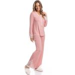 Pijama Feminino Wide Leg Com Abertura Maju é puro chame! Em modelagem muito confortável, sua blusa possui decote em V com abertura frontal com perfeito acabamento e botões bem fixados. Suas mangas são longas com aplicação de renda na barra. Detalhe para seu delicado laço no acabamento da abertura. Sua calça possui modelagem Wide Leg, sendo uma opção bem moderna e confortável para seus dias. Conta com uma linda e delicada renda em suas laterais. Em duas opções de cores para você aproveitar a melhor estação do ano!