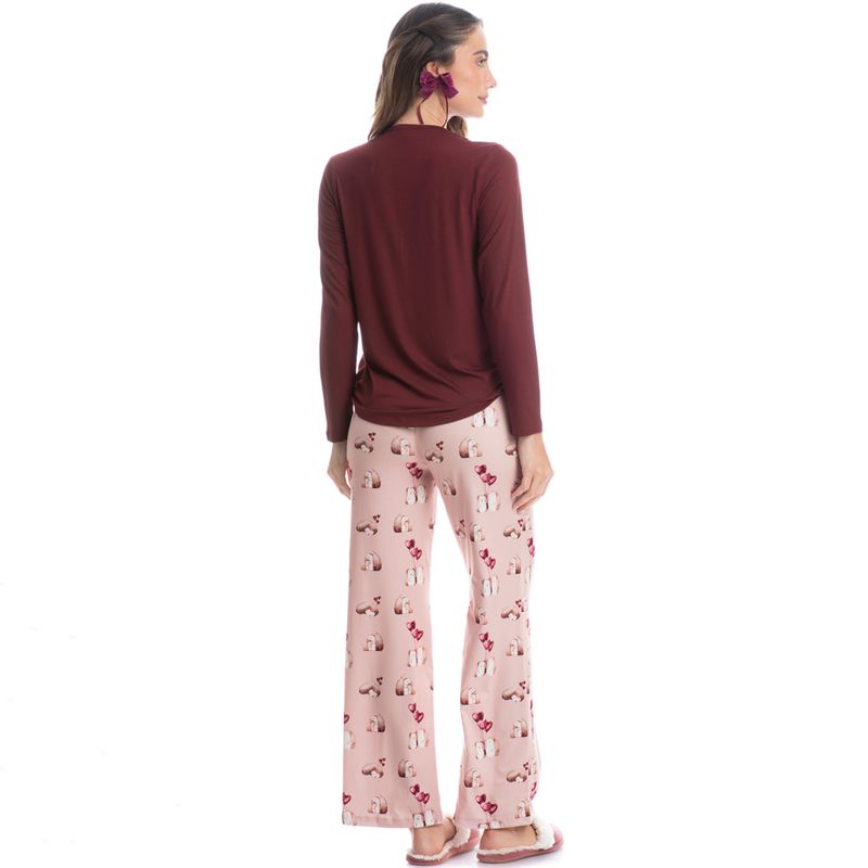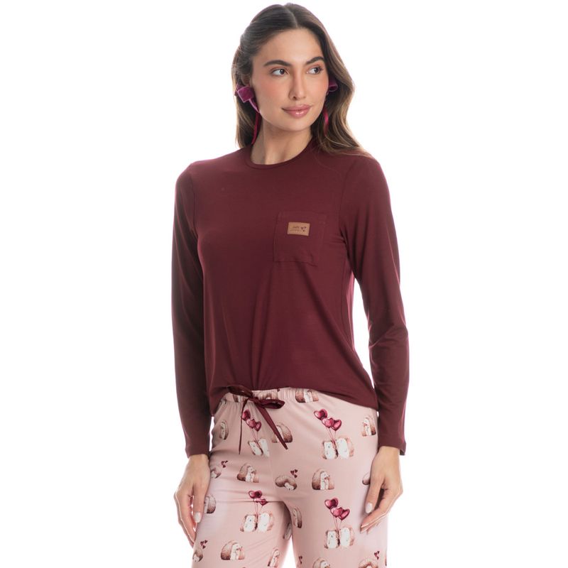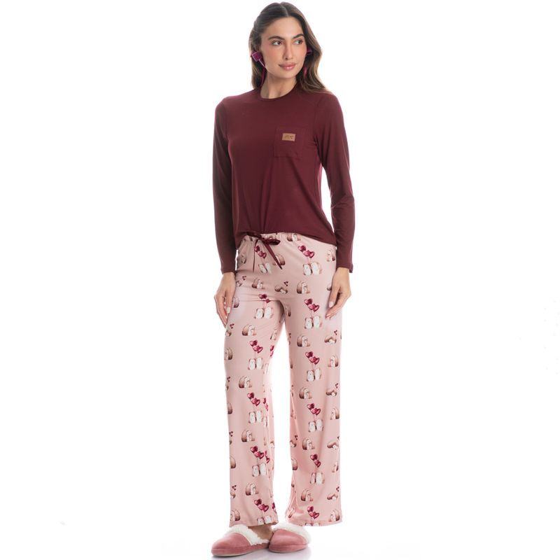 Pijama Feminino Wide Leg Cute Love é estilo para suas horas de lazer! Sua blusa lisa em modelagem ampla e confortável, conta mangas longas e decote redondo com aplicação de viés. Detalhe para seu bolso com uma exclusiva etiqueta personalizada. Sua calça ampla e confortável com modelagem wide leg possui uma linda e divertida estampada, elástico macio e um lindo laço de cetim no cós. Perfeito para estar com você nas melhores olhas do seu dia!