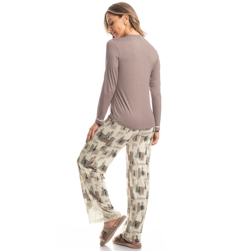 Pijama Feminino Wide Leg Pinheiros é puro chame! Em modelagem muito confortável, sua blusa lisa possui manga longa, e decote redondo com acabamento em viés. Detalhe para seu delicado bordado logo Daniela Tombini em tom contrastante na lateral esquerda. Sua calça possui modelagem Wide Leg, sendo uma opção bem moderna e confortável para seus dias. Conta com uma linda e delicada renda em suas laterais e laço de cetim no centro do cós. Detalhe para sua estampa de pinheiros, garantindo muita exclusividade!