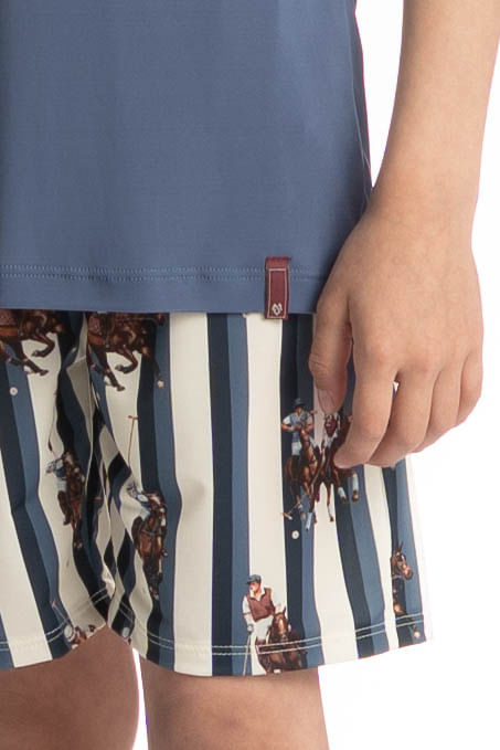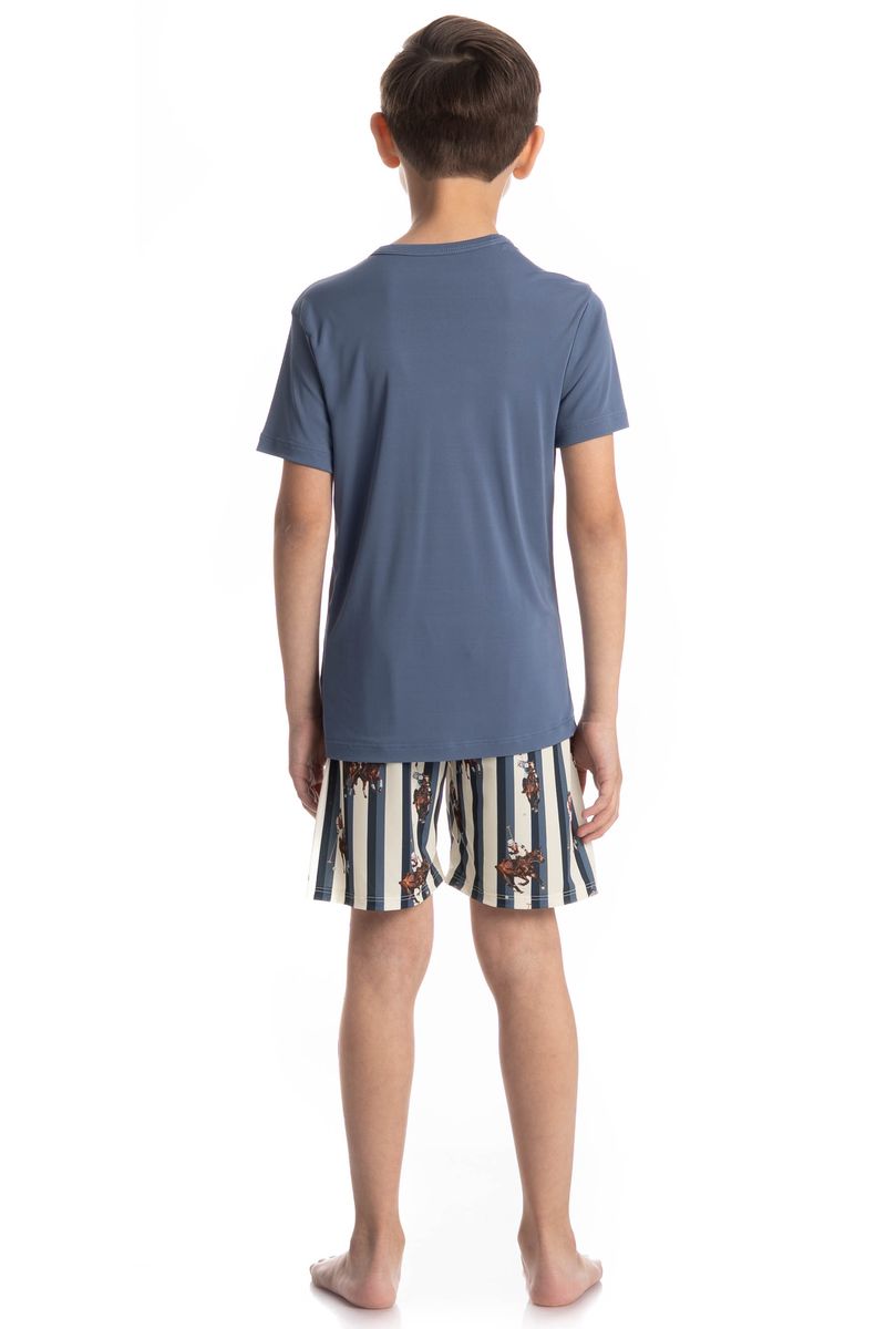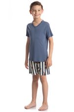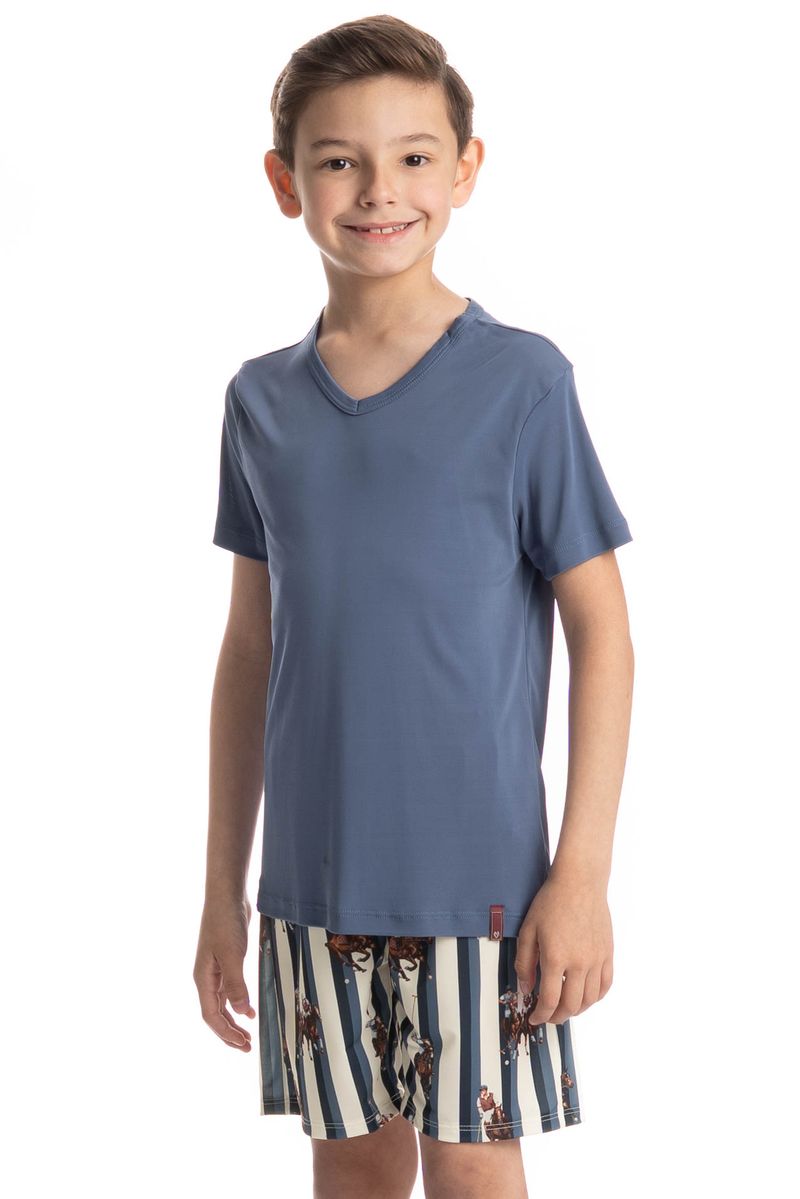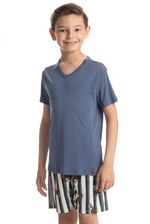 Pijama Infantil Masculino Curto Clóvis é puro estilo pensado no conforto do seu pequeno! Sua blusa manga curta, é lisa com decote em V, seu Short é todo estampado. Muito estilo e conforto para estar com você nos melhores momentos!