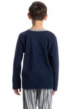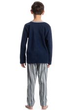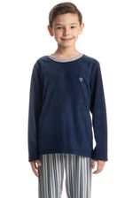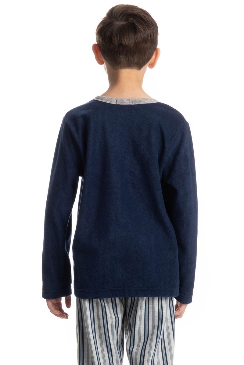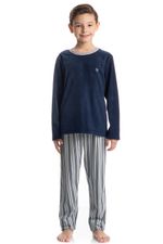 Pijama Infantil Masculino Liam é puro conforto para as noites frias! Sua Blusa manga longa em decote redondo é toda lisa com um lindo bordado logo Tombini na lateral esquerda. Já sua calça conta com uma linda estampa listrada, trazendo estilo e elegância nas suas melhores horas!