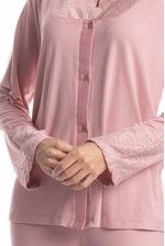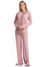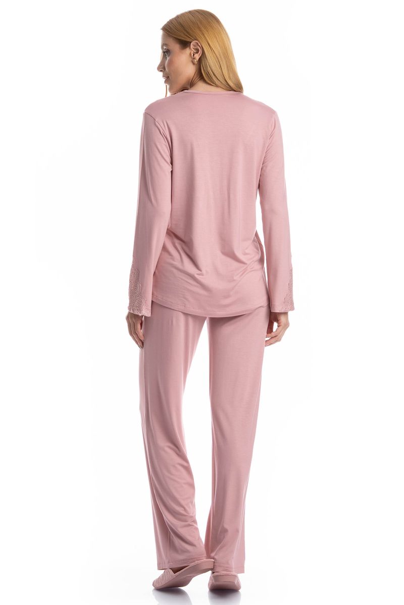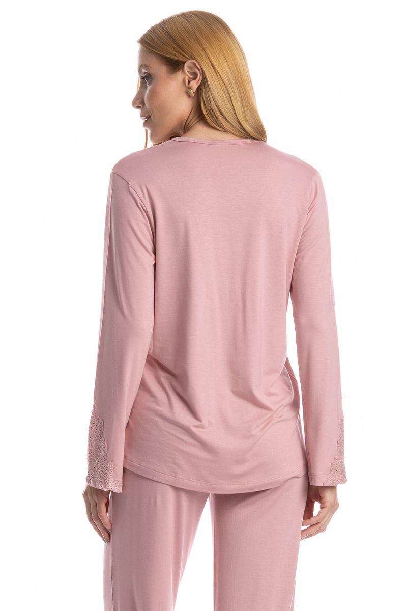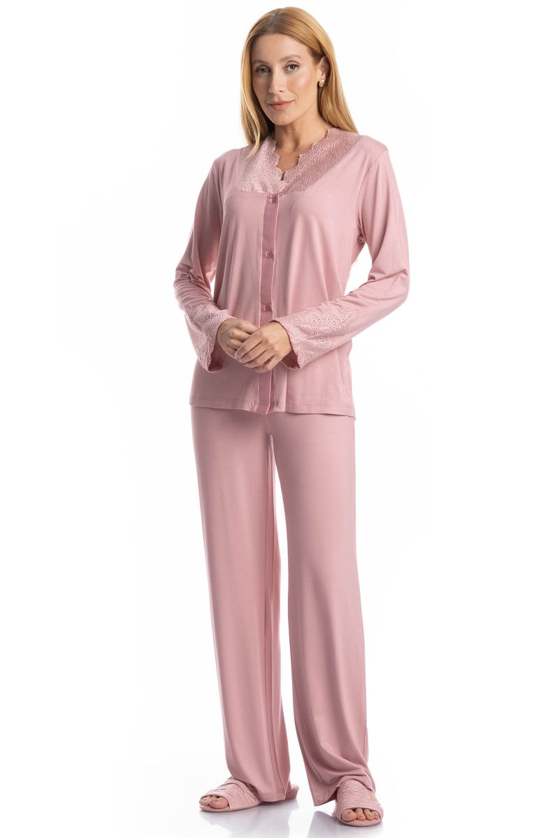 O Pijama Longo Americano Laise é a combinação perfeita entre elegância e conforto para suas noites e momentos de descanso. Confeccionado em tecido macio e de toque suave, ele proporciona caimento leve e agradável sobre a pele. A blusa de manga longa possui abertura frontal com botões, trazendo praticidade e um visual clássico, além de delicado detalhe em renda no decote e nos punhos, que adiciona um charme romântico à peça. A calça longa complementa o conjunto com modelagem soltinha e confortável, garantindo liberdade de movimentos. Ideal para quem busca dormir com estilo sem abrir mão do bem-estar. Um pijama delicado, feminino e perfeito para tornar seus momentos em casa ainda mais especiais!