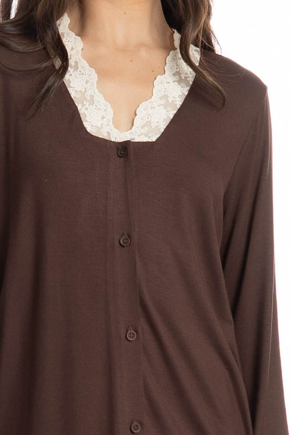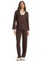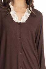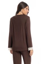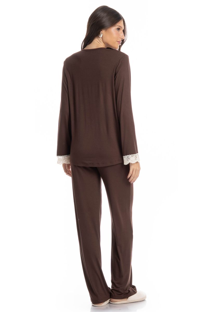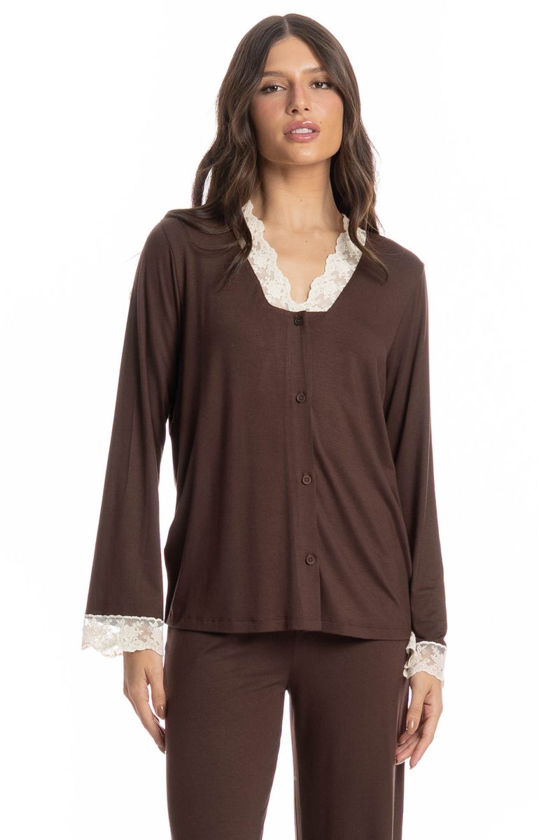 O Pijama Longo Americano Sépia combina conforto e sofisticação em um design clássico. A blusa de manga longa possui abertura frontal com botões, além de delicados detalhes em renda no decote e nos punhos, que trazem um toque feminino e elegante à peça. A calça longa apresenta caimento confortável, ideal para noites de descanso com muito bem-estar.
