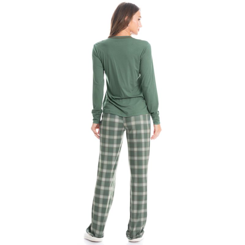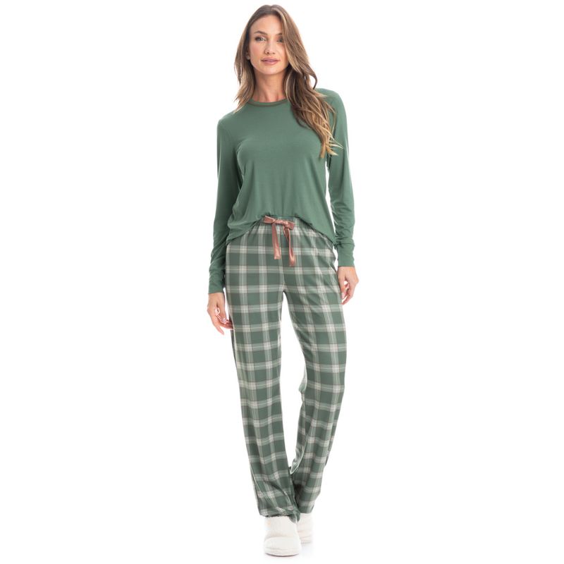Pijama Longo Feminino Enjoy é excelente para suas noites! Em modelagem muito confortável, sua blusa lisa possui mangas longas com punho e decote redondo com acabamento em viés e trançador de tom contrastante. Detalhe para sua etiqueta de couro na lateral inferior esquerda. Sua calça é toda estampada em um moderno xadrez e conta com um lindo laço de cetim no centro do cós. Muito estilo e conforto para estar com você nas melhores horas do seu dia!