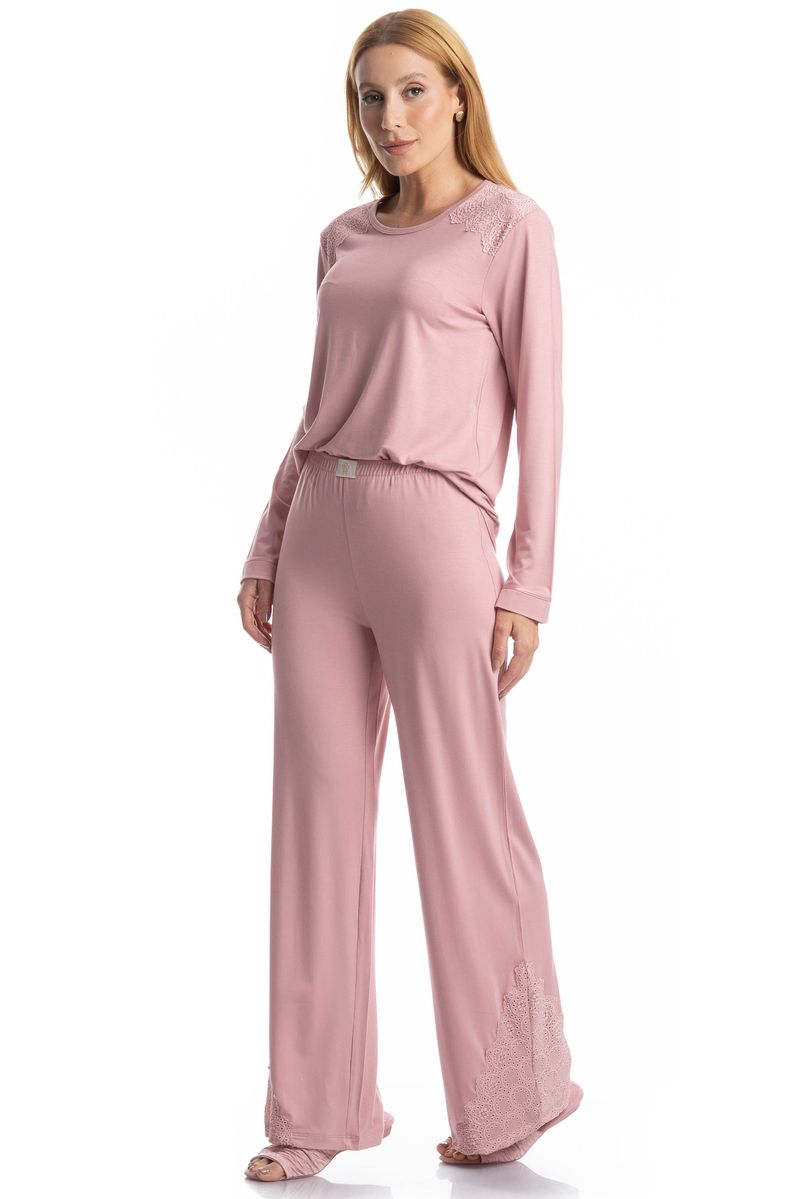 Pijama Longo Laise é puro charme! Em modelagem muito confortável, sua blusa manga longa possui decote redondo, e aplicação em renda. Sua calça com modelagem mais solta, conta com elástico macio para um melhor descanso, possui etiqueta logo Daniela Tombini e conta com aplicação de uma linda e delicada renda na barra. Perfeito para momentos de descanso cheio de conforto e elegância!
