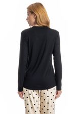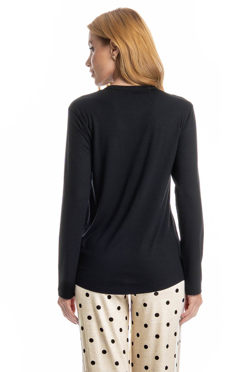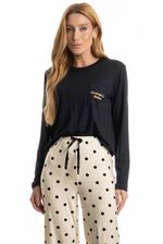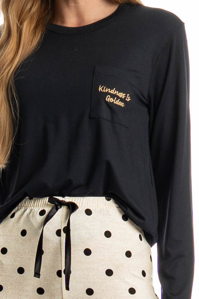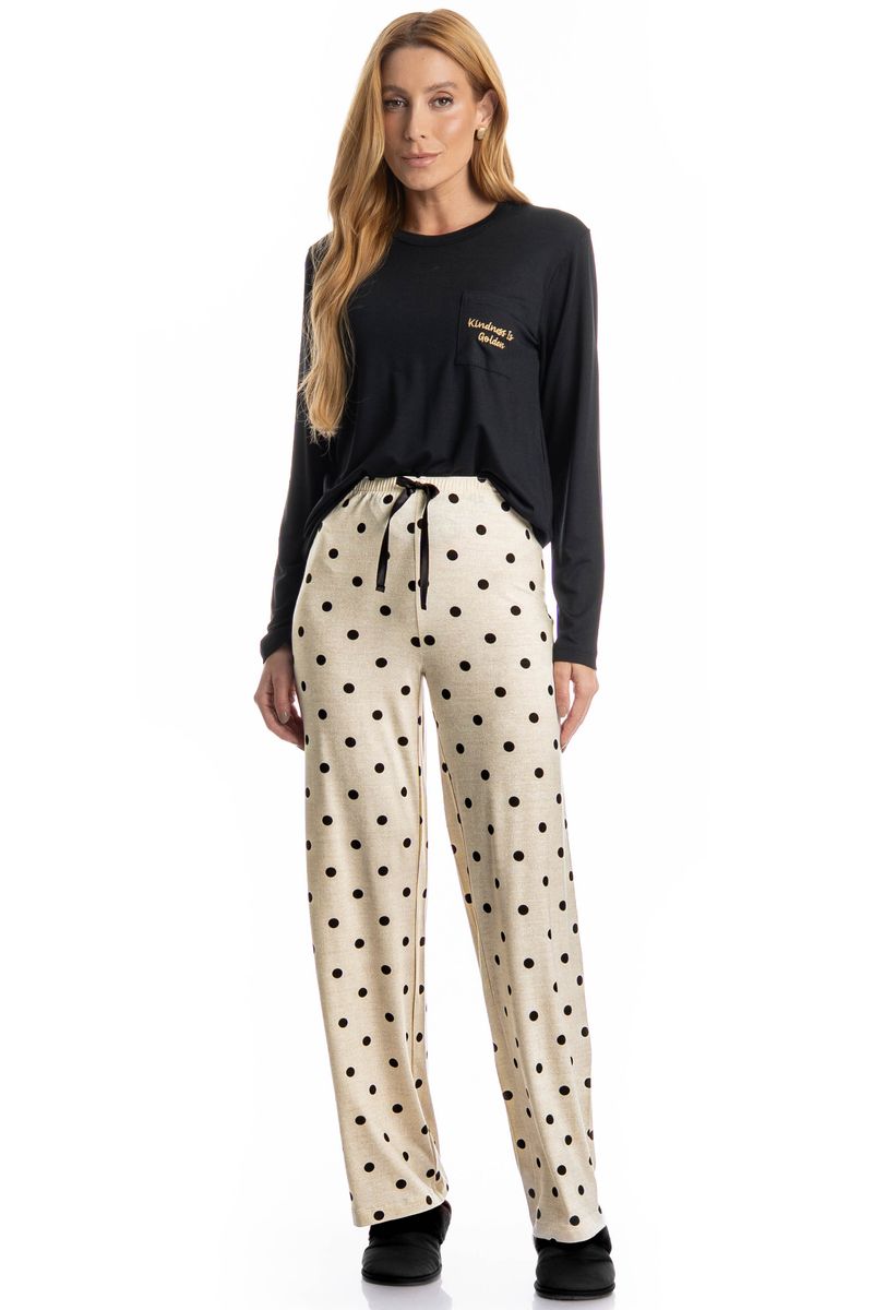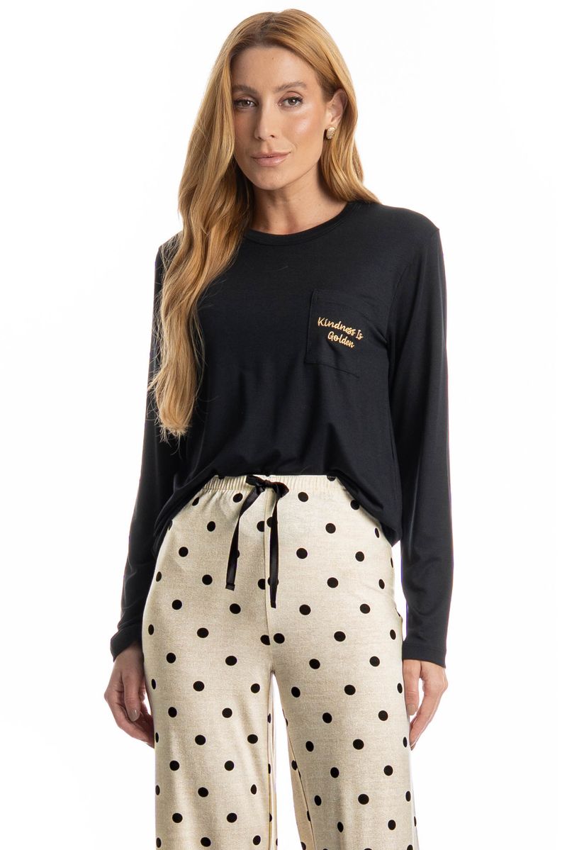Pijama Longo Sabrina confortável e sofisticado, ideal para quem busca estilo aliado ao bem-estar. Composto por blusa de manga longa e calça longa, o modelo apresenta caimento leve e fluido, proporcionando liberdade de movimentos e toque macio sobre a pele. A blusa possui design minimalista e possui bolso na lateral esquerda com o bordado Kindness Is Golden. Enquanto a calça conta com cós e falso amarre, detalhe para sua linda estampa de poá. Versátil, é perfeito para momentos de descanso cheio de conforto e elegância!