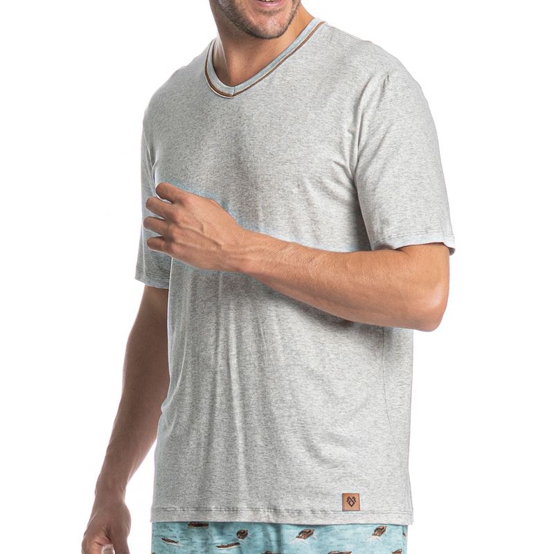 Sua blusa confeccionada em Viscolycra mescla tecido que possui as mesmas qualidades da Viscolycra lisa, porém combina fios de coloração em tons de cinza resultando em um tecido com aparência mesclada entre fios claros e escuros, além dos fios de elastano garantindo maciez e elasticidade.