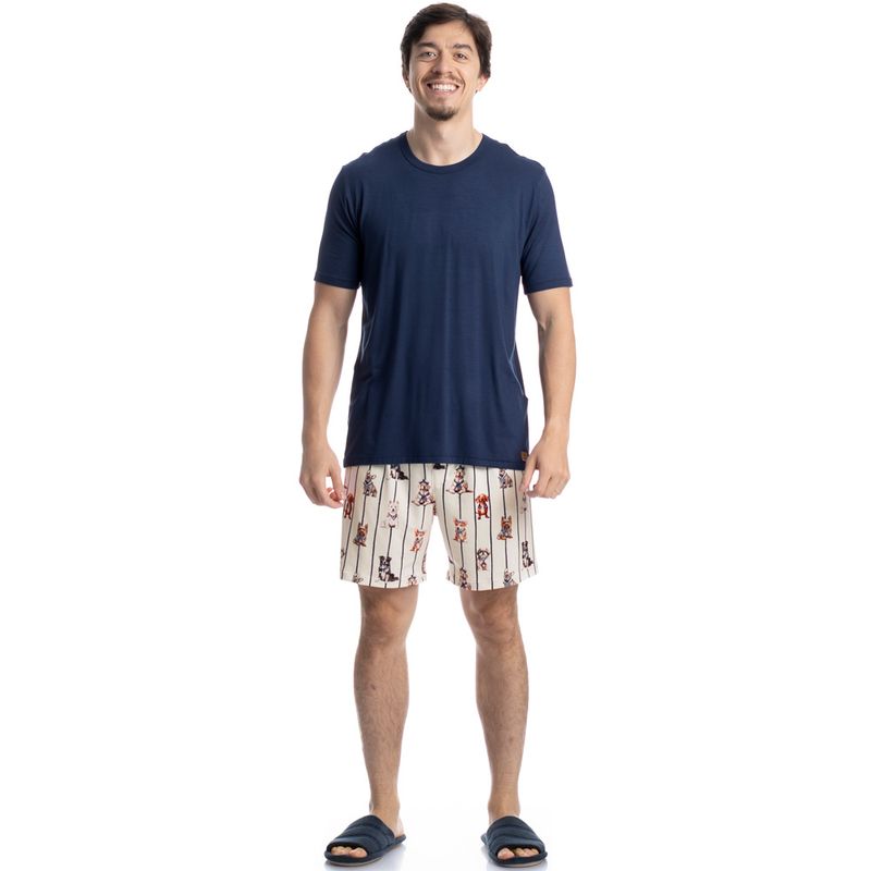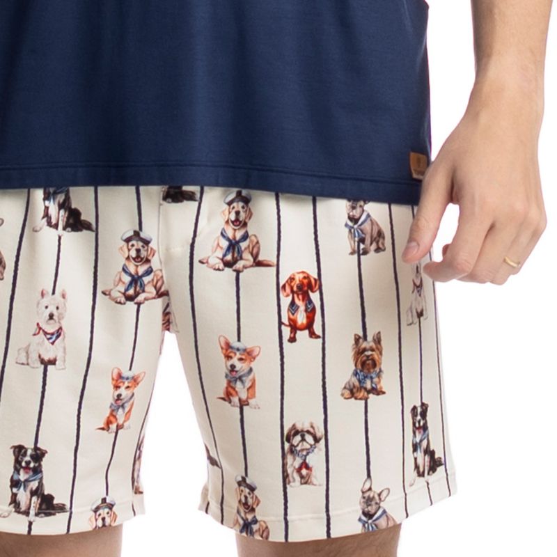 Pijama Masculino Curto Sailor Dogs Tombini é perfeito para suas noites! Em modelagem muito confortável, sua blusa manga curta possui decote redondo com acabamento em viés. Detalhe para a etiqueta Personalizada na lateral inferior esquerda da peça. Já o seu shorts em modelagem ampla e confortável, é todo estampado em uma divertida e exclusiva estampa de cães marinheiros, e possui também elástico macio no cós que garante muito conforto para as horas de descanso!