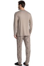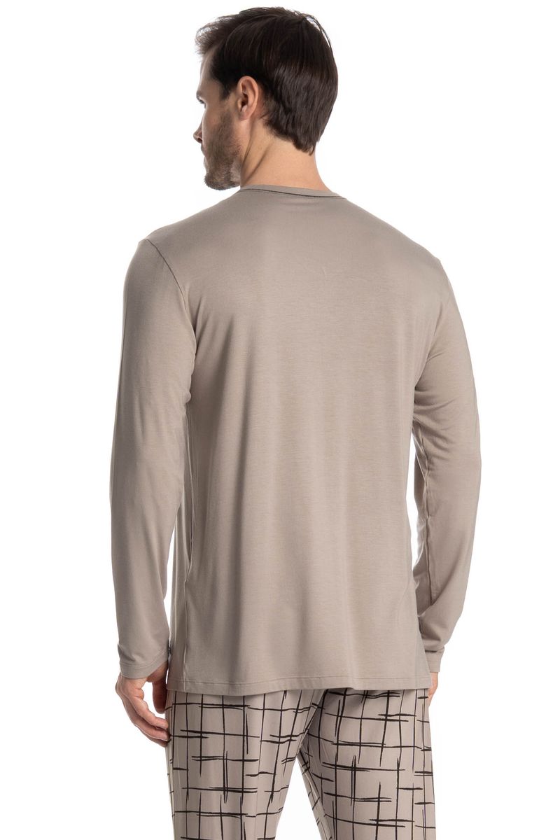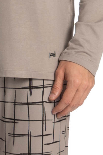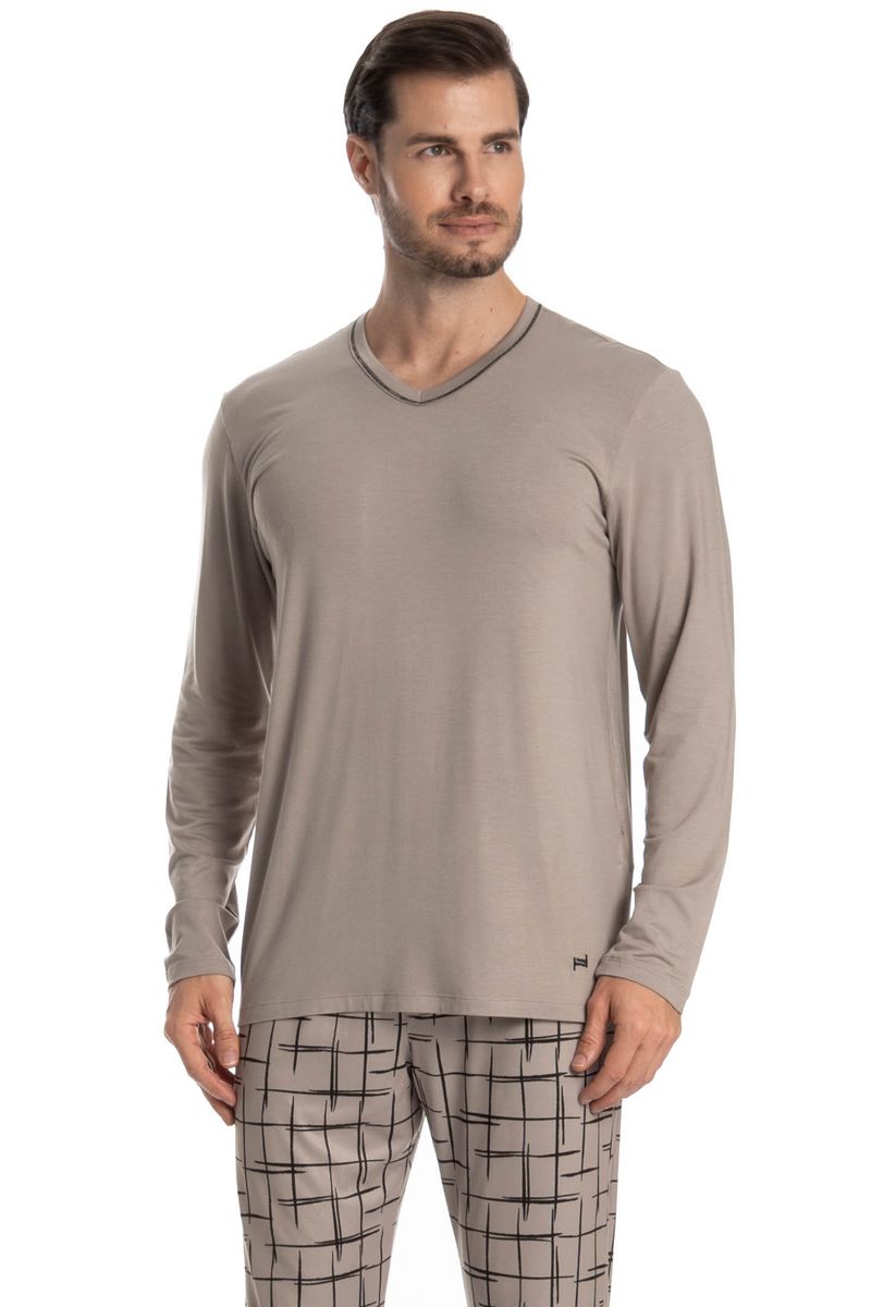 Pijama Masculino Longo Felipe é perfeito para suas noites! Em modelagem muito confortável, sua blusa manga longa possui decote em V com acabamento em viés com trançador de tom contrastante. Detalhe para seu bordado Tombini na lateral inferior esquerda. Já sua calça em modelagem ampla e confortável, é todo estampado e possui elástico macio no cós que garante muito conforto para as horas de descanso!
