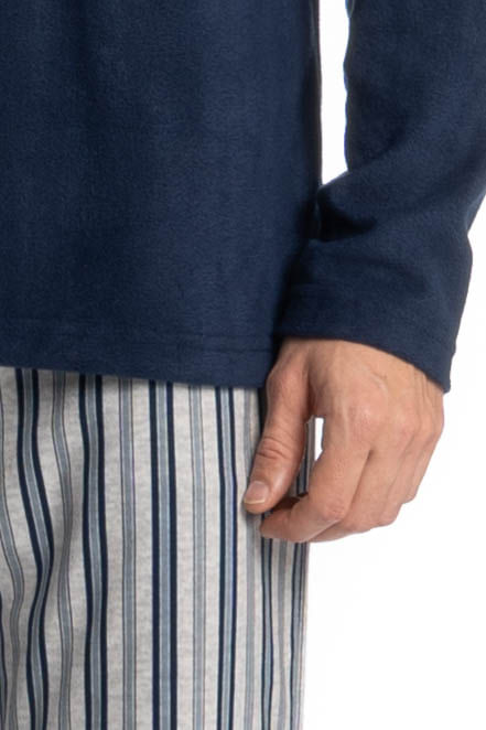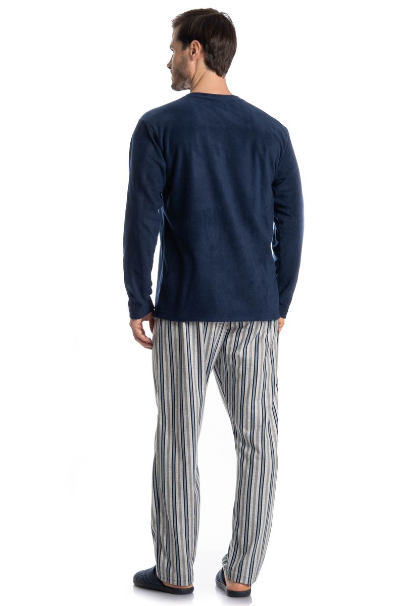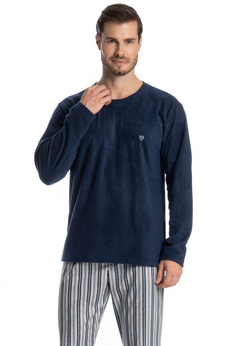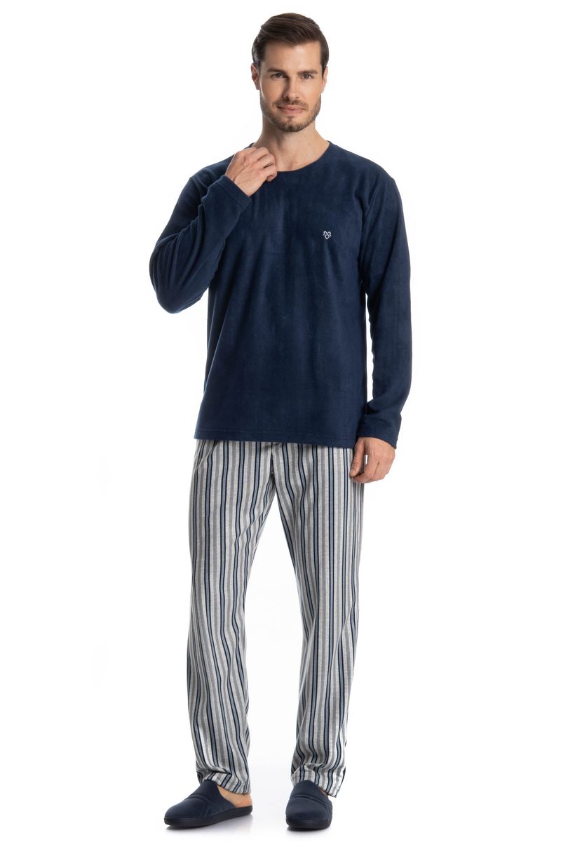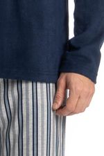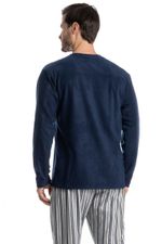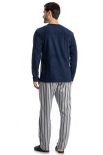 Pijama Masculino Longo Liam é puro conforto para as noites frias! Sua Blusa manga longa em decote redondo é toda lisa com um lindo bordado logo Tombini na lateral esquerda. Já sua calça conta com uma linda estampa listrada, trazendo estilo e elegância nas suas melhores horas!