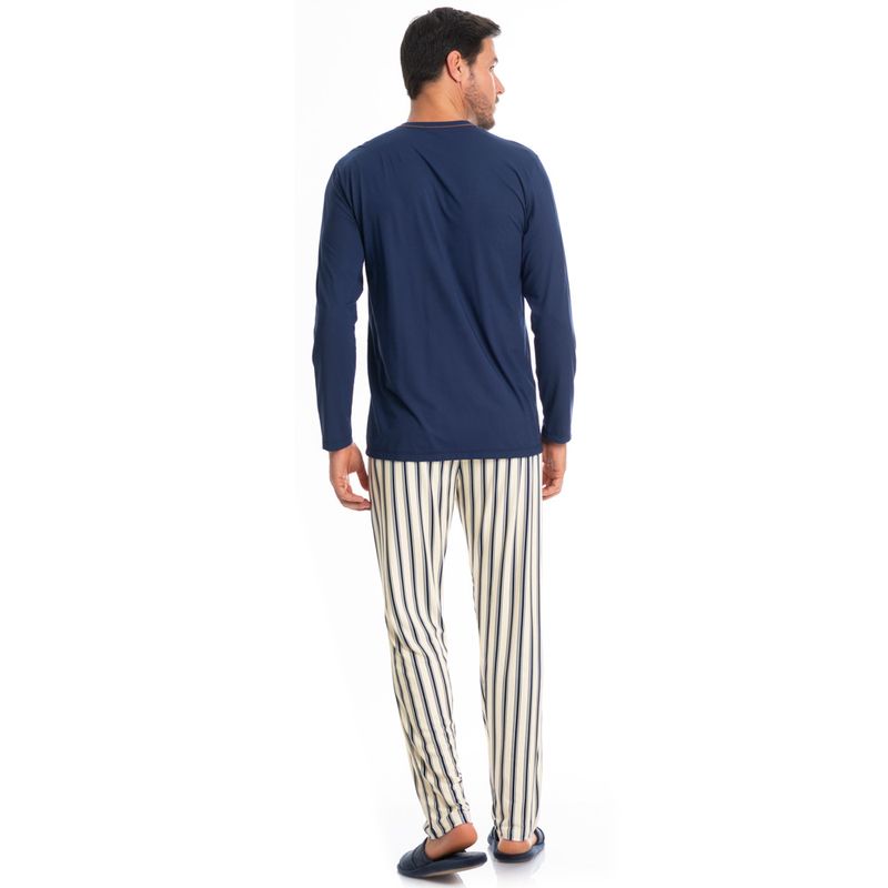 Pijama Masculino Longo Listrado Pietro Tombini é excelente para suas noites! Em modelagem muito confortável, sua blusa possui decote em V com acabamento em viés com trançador de tom contrastante. Detalhe para a etiqueta termocolante de couro Tombini na lateral inferior esquerda. Sua calça listrada possui modelagem ampla e confortável, proporcionando uma excelente noite de descanso. O melhor para estar com você nas melhores horas do seu dia!