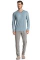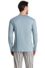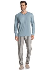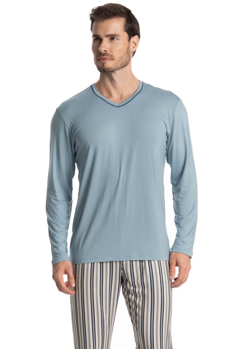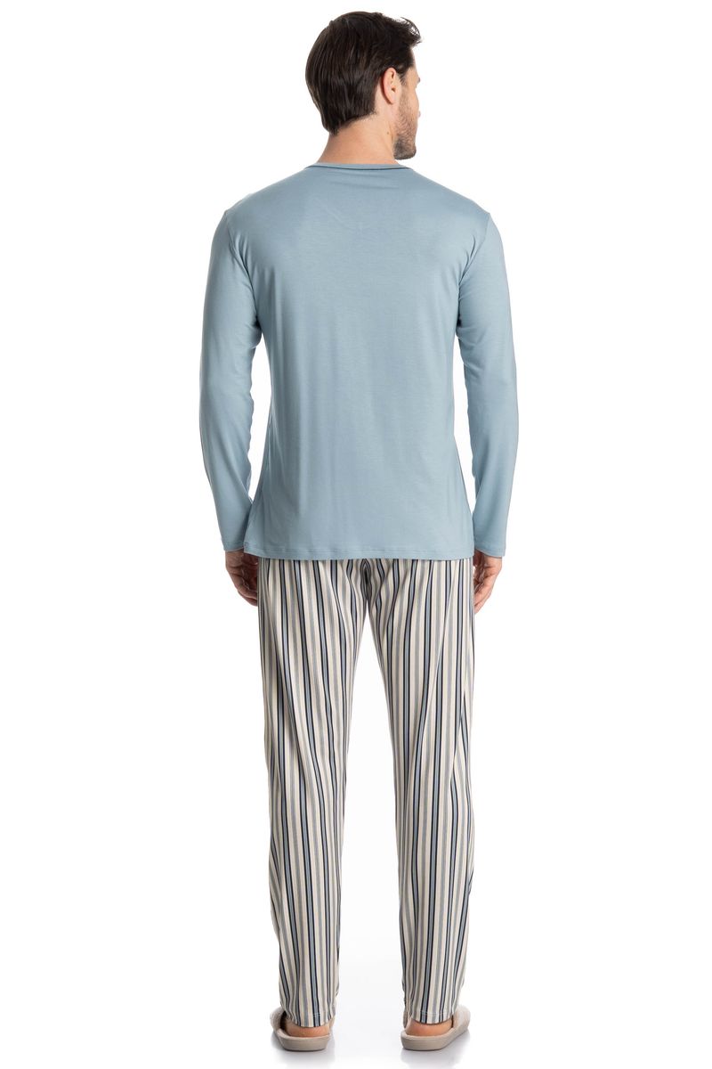 Pijama Masculino Longo Mateo é estilo para as suas noites! A blusa em manga curta possui uma modelagem ampla, confortável e aconchegante com detalhe em trançador de tom contrastante no decote. Detalhe para sua etiqueta personalizada Tombini na leteral inferior esquerda da peça. Já a calça em modelagem ampla é toda estampada com uma moderna listra, e possui elástico macio proporcionando uma noite confortável.