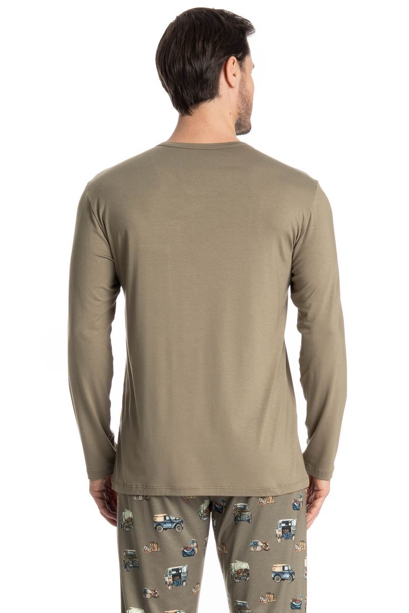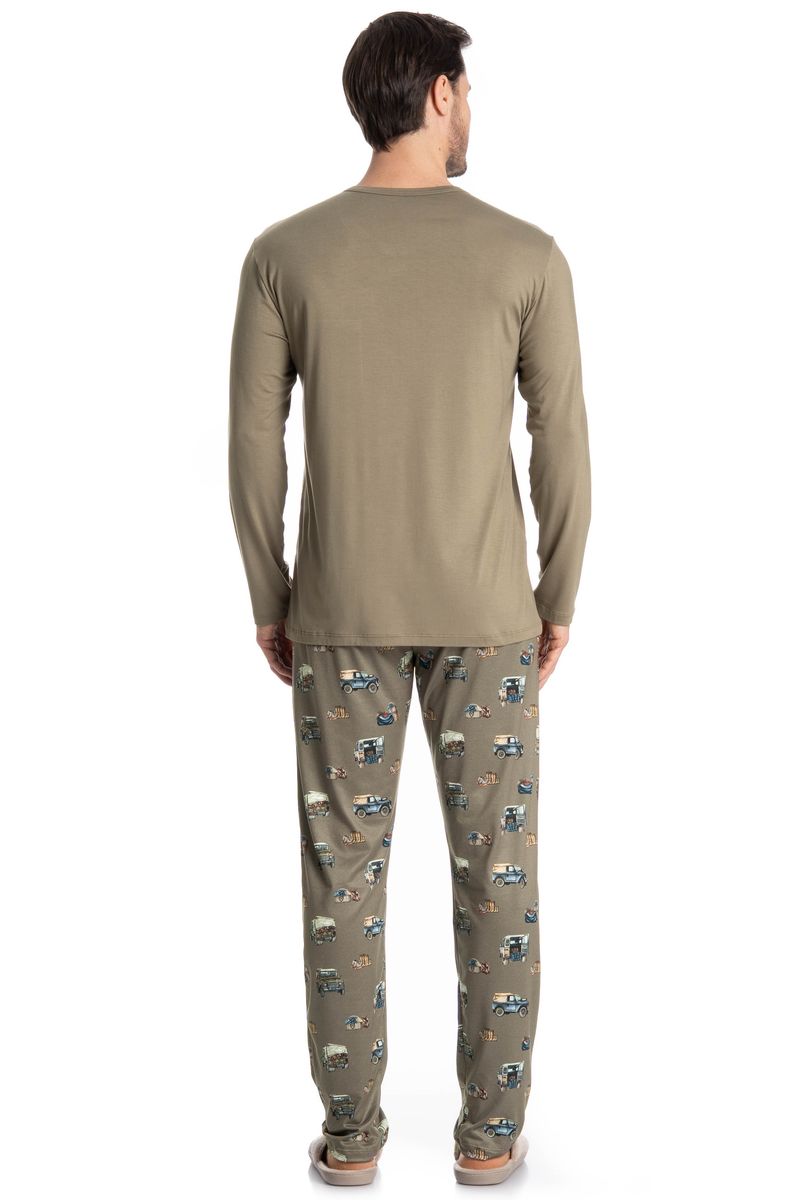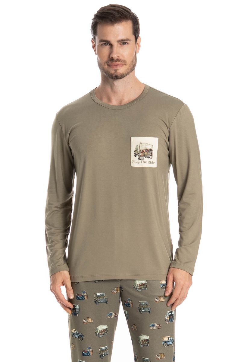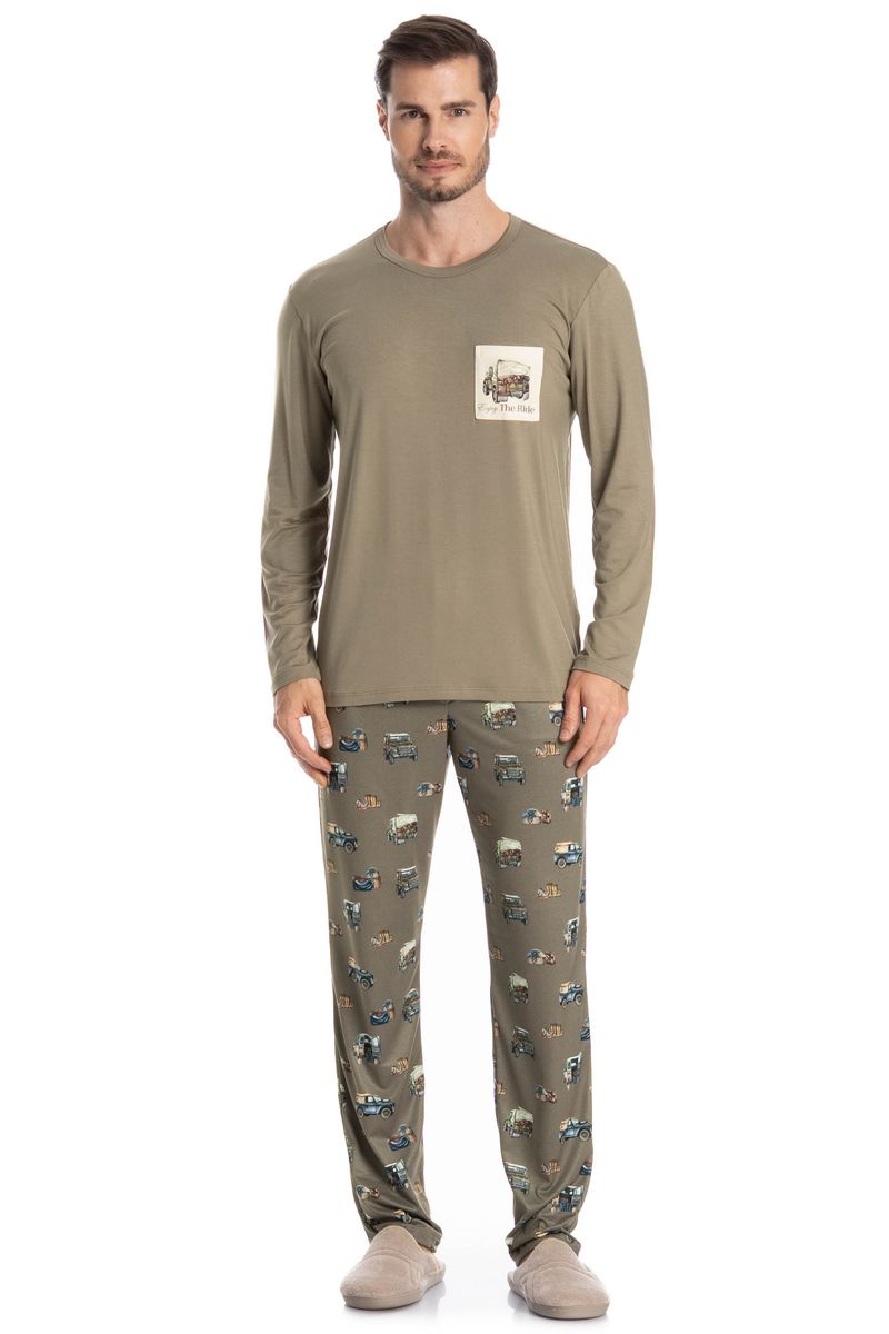 Pijama Masculino Longo Ride é o estilo que você ama! Sua blusa em modelagem ampla e confortável, possui decote redondo debruado com viés, e conta com bolso na lateral esquerda com a frase Enjoy The Ride. Já a calça em modelagem ampla e confortável, é todo estampado com elementos de carros, e possui elástico macio no cós que garante muito conforto para as horas de descanso!