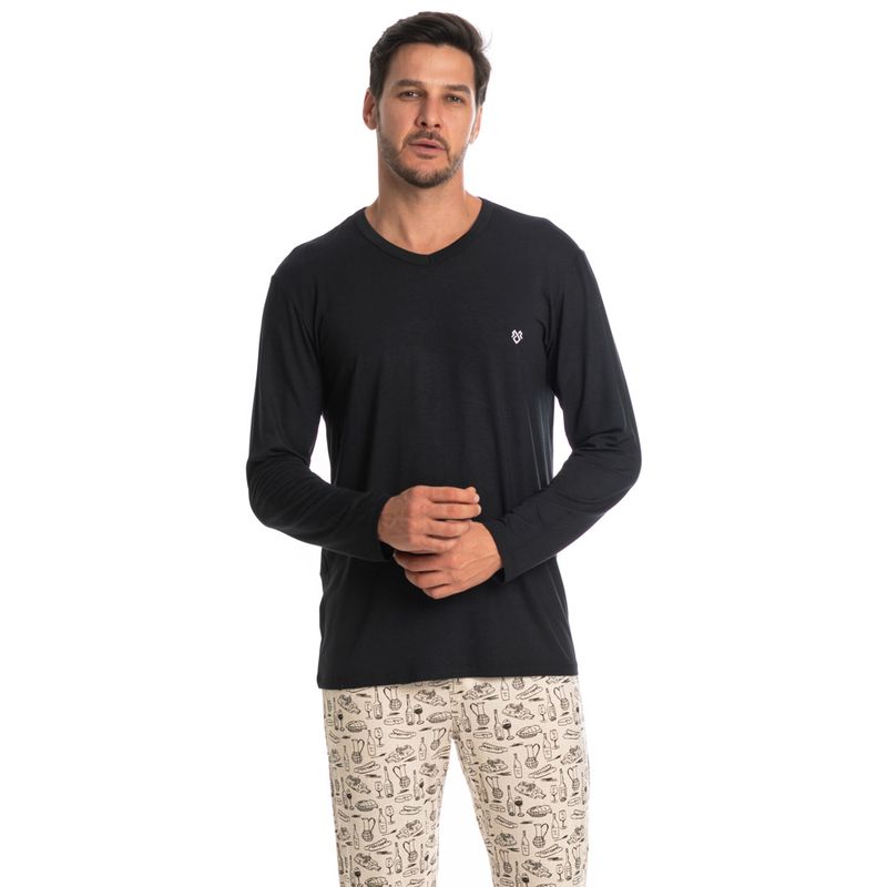 Pijama Masculino Longo Vino Tombini é excelente para suas noites! Em modelagem muito confortável sua blusa possui decote em V com acabamento em viés. Detalhe para o bordado logo Tombini em tom contrastante na lateral esquerda da peça. Sua calça é toda estampada em uma moderna estampa com elementos de vinho, e possui elástico extremamente confortável no cós. Muito estilo e conforto para estar com você nas melhores horas do seu dia!