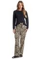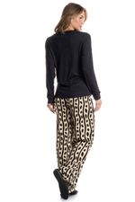 Já sua calça é confeccionada em Cetim um tecido plano de aspecto brilhante, liso, de toque fluido e macio. Composto por fios de poliéster e elastano garantindo maior conforto e elasticidade ao produto. Sua composição permite estampas com mais definição, cor e brilho acetinado.