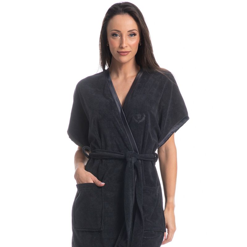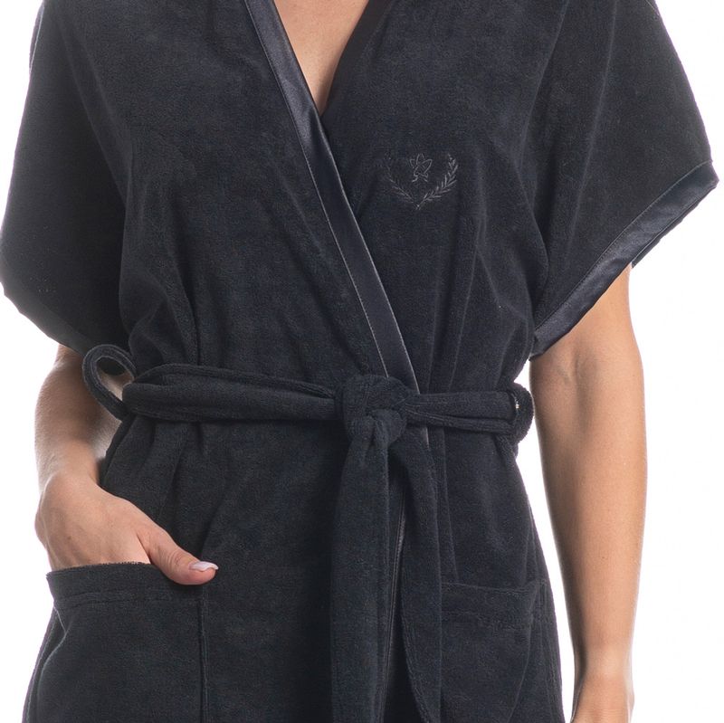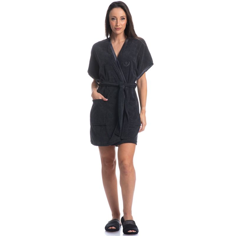 Robe Curto Com Bolso Olívia é conforto com praticidade para combinar com o seu amor! Feito em Atoalhado, tecido com predominância do algodão, fios em relevo e em forma de laços. A formação do fio se dá através de um efeito felpudo em ambas as faces. Com toque suave e gostoso, ideal para ficar em casa, conta com modelagem curta, bolsos externos frontais, e viés em cetim nas mangas e suas faixas da frente, detalhes que fazem a diferença!