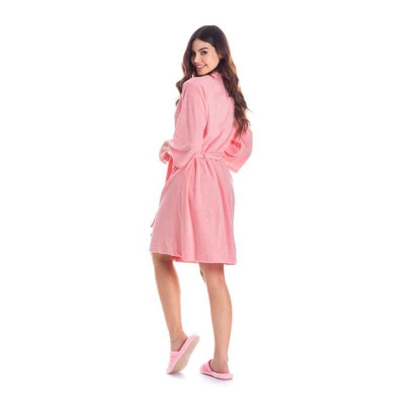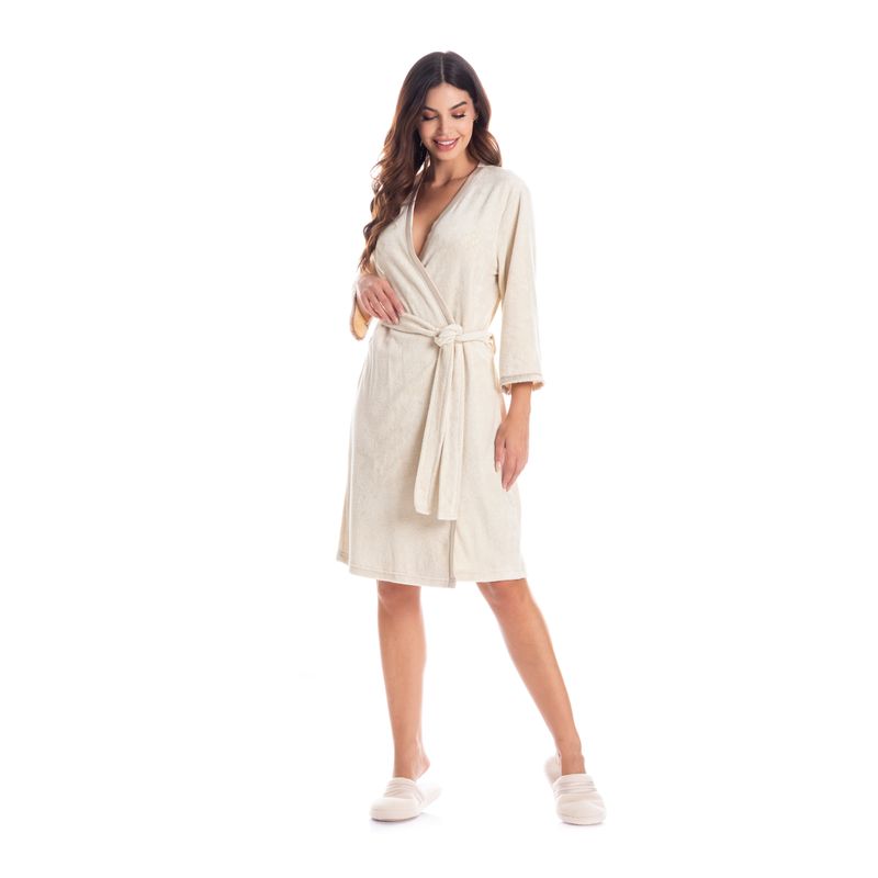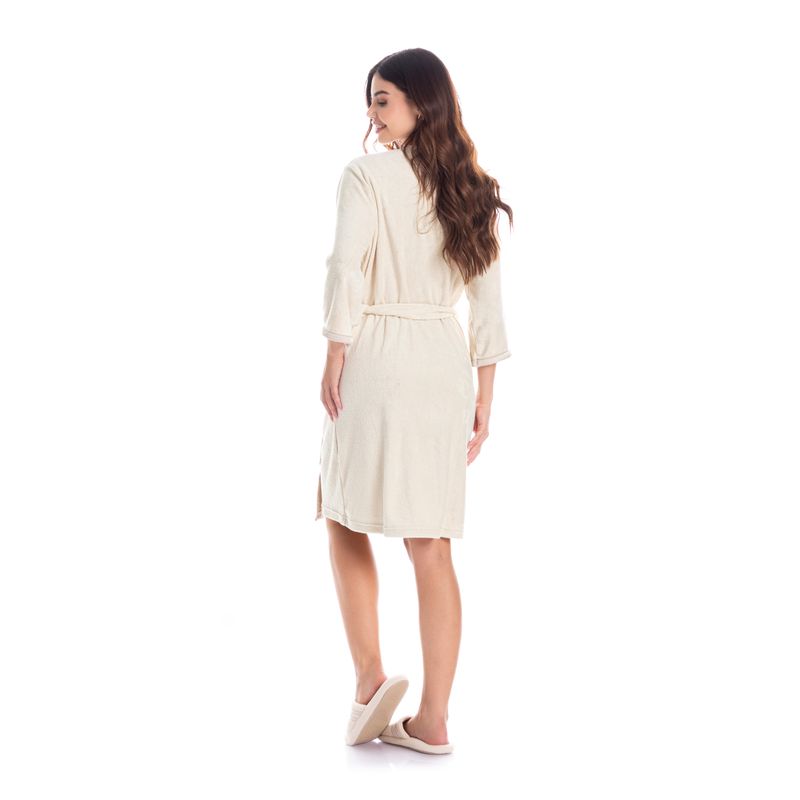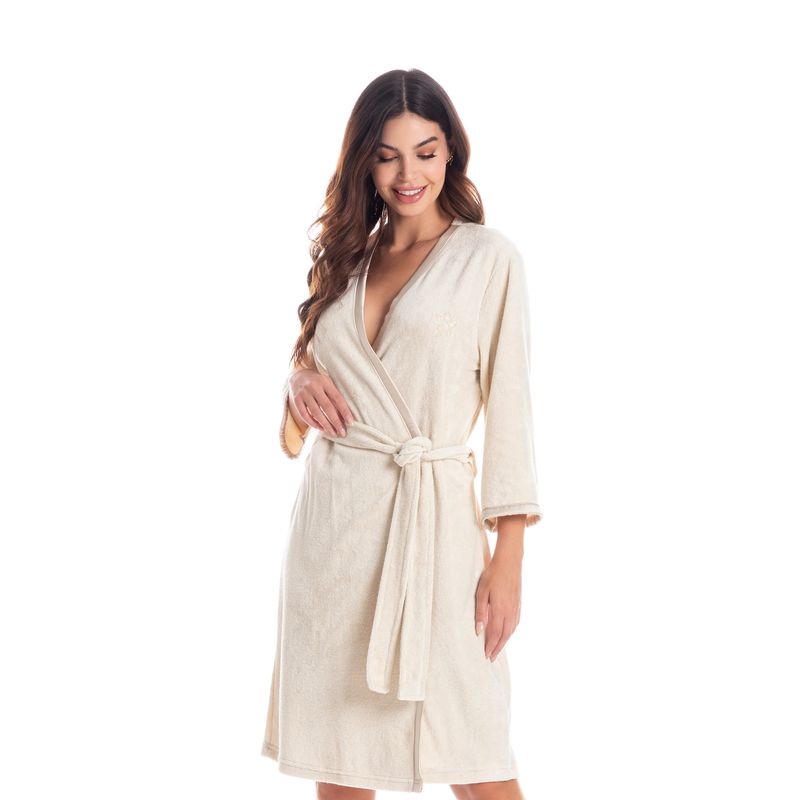 Robe Feminino Curto Em Atoalhado Liss é puro charme! Em comprimento curto e mangas 7/8. Suas frentes e mangas possui acabamentos em cetim, além de amarres internos. Detalhe para o bordado logo Daniela Tombini na lateral esquerda. Um verdadeiro charme!