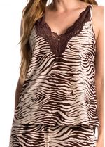 Confeccionado em New print, tecido extremamente macio e leve, formado por fios de filamentos de poliéster e elastano.