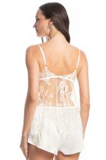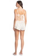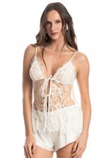 Short Doll Mini Maitê delicado e extremamente sofisticado, perfeito para momentos especiais. Confeccionado em renda com transparência suave, ele valoriza a silhueta com sensualidade e leveza. A blusa possui alças finas reguláveis e decote em V, além de amarração frontal que traz charme extra à peça. O short em tecido leve e macio garante conforto e fluidez. Uma peça que une romantismo, sensualidade e delicadeza na medida certa!