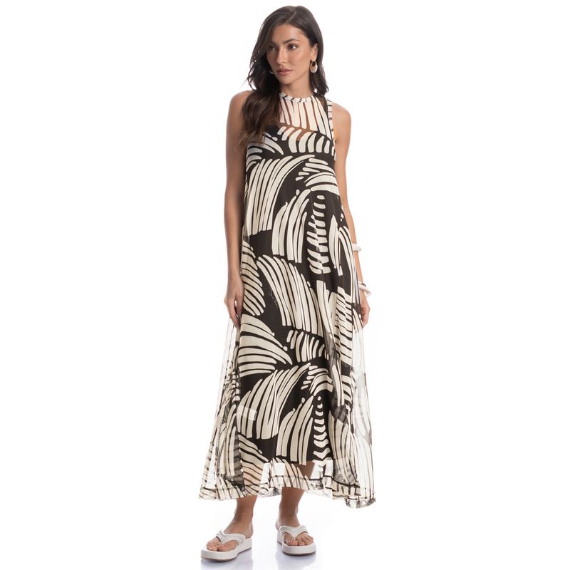 Vestido Amplo Tule Mistral traduz autenticidade e movimento em uma só peça. Com modelagem regata ampla e comprimento longo, ele apresenta estampa abstrata impactante sobre tule leve e fluido. O forro interno em Viscolycra garante conforto e caimento perfeito. Ideal para produções descomplicadas que valorizam sua personalidade em qualquer ocasião.