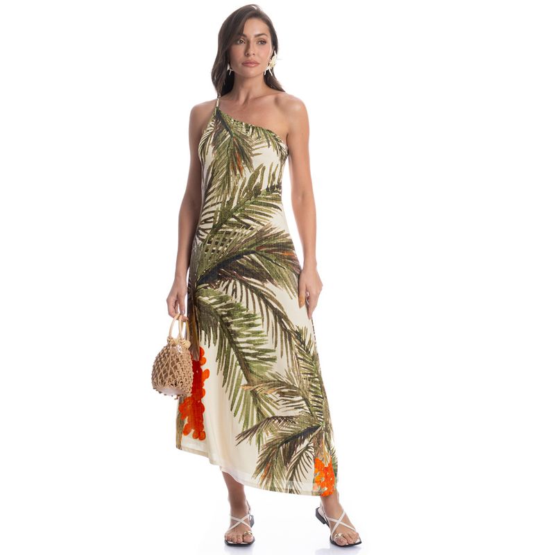 Vestido Assimétrico Coqueiros é perfeito para você aproveitar os dias quentes! Em uma nova modelagem priorizando sempre pelo seu bem-estar. O Vestido Coqueiros conta com uma linda e exclusiva estampa, é composto por um modelo que te permitem aproveitar o melhor da estação, com um conforto extraordinário. Possui modelagem de um ombro só, com comprimento longo com sua barra também assimétrica, conferindo ainda mais estilo para a peça.