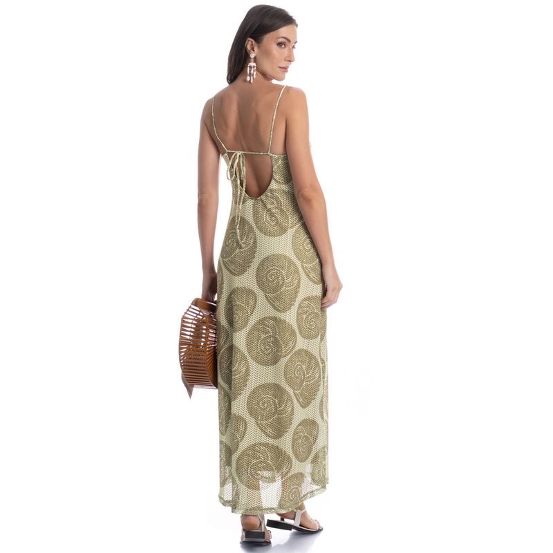 Vestido Conchas destaca a delicadeza e a autenticidade com uma modelagem fluida. Com decote reto e alças finas que se prolongam em amarração nas costas, ele evidencia a região do colo com leveza. O rendão estampado com conchas cria um efeito visual sofisticado, enquanto o forro interno garante conforto absoluto. Uma escolha versátil que transita do casual ao elegante com naturalidade.