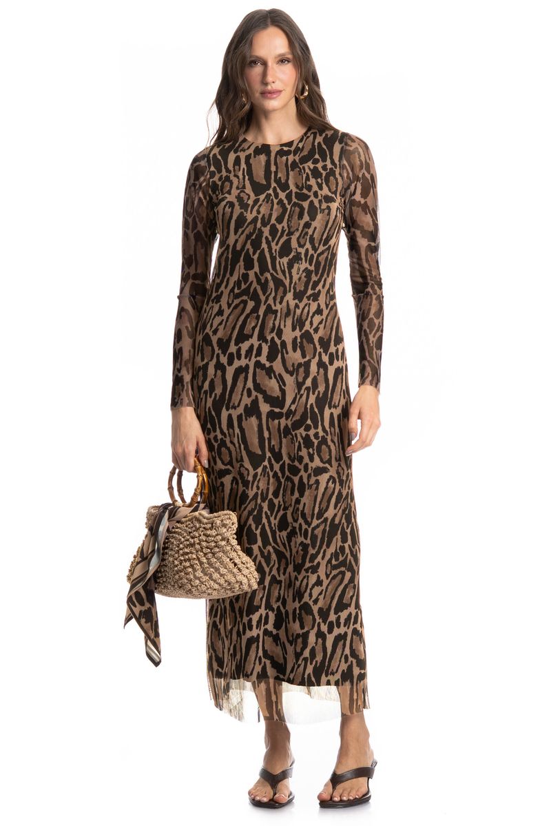 O Vestido De Tule Com Manga Longa Onça combina elegância e leveza em um design moderno, possui mangas longas, recortes franzidos e comprimento longo, garantindo caimento fluido e sofisticado. Acompanha forro interno na mesma tonalidade para maior conforto e discrição. Ideal para eventos e ocasiões especiais.
