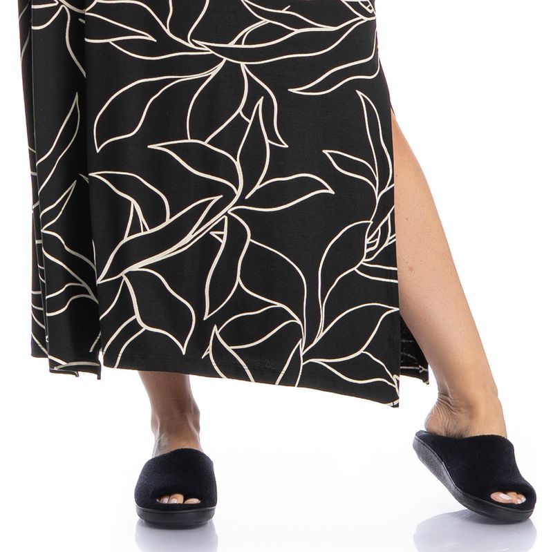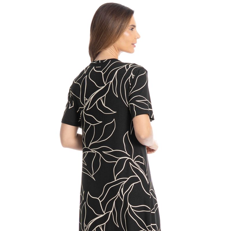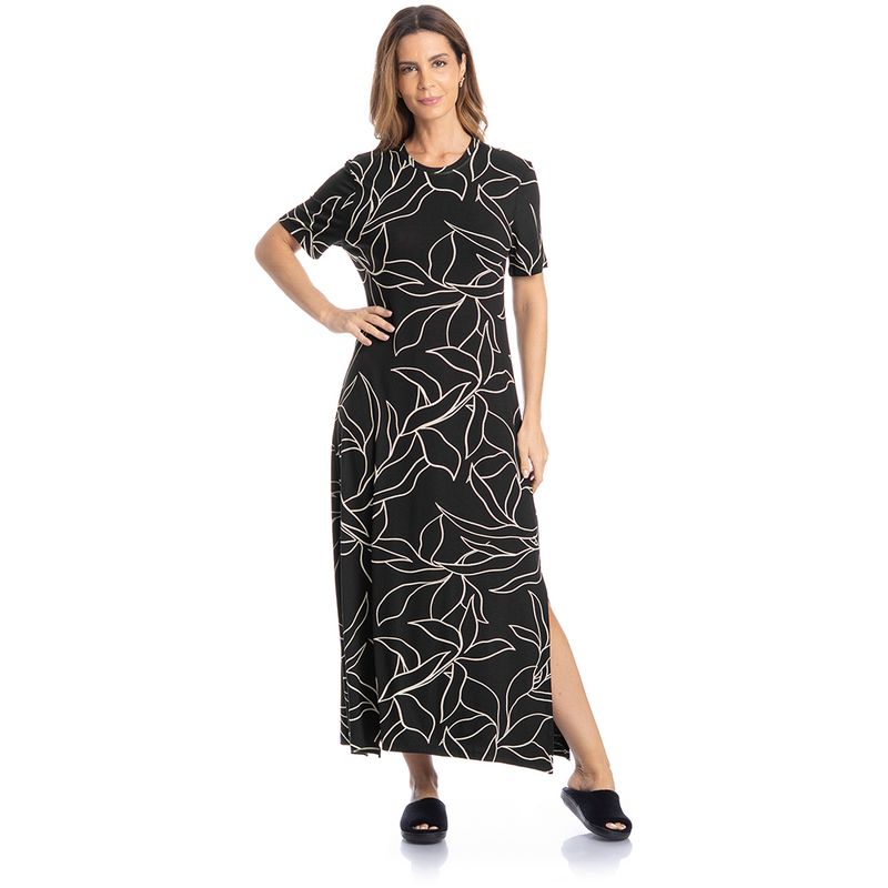 Vestido Longo Michele é puro charme! Em comprimento longo e modelagem ampla, o Vestido Michele conta com mangas curtas e decote redondo em gola, já suas aberturas laterais garantem excelente caimento e fluidez. Detalhe para sua exclusiva e moderna estampa de folhagem, garantindo muito estilo à peça!