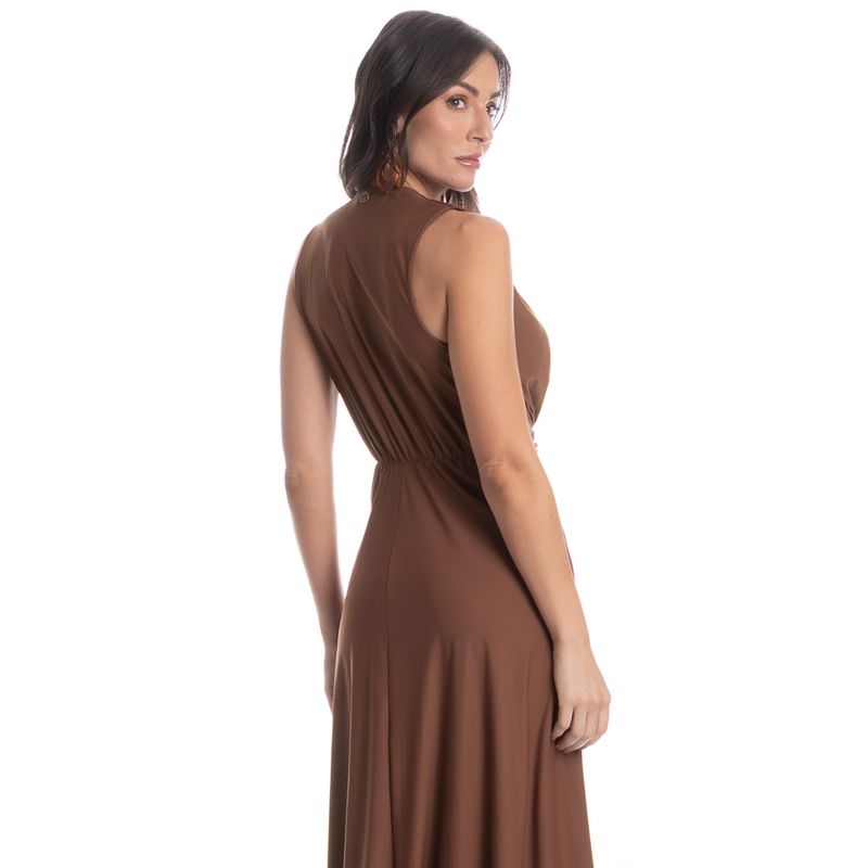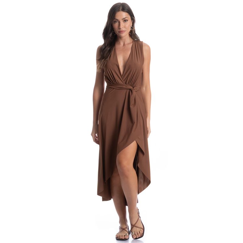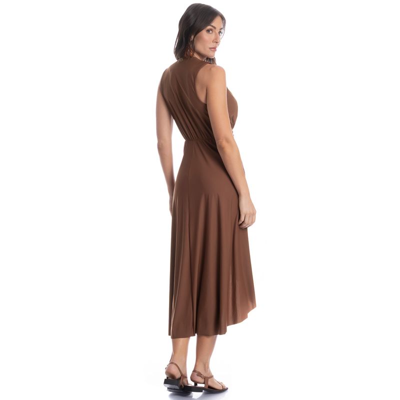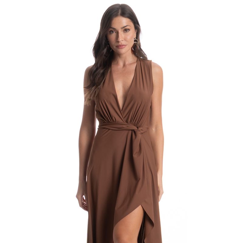 Vestido Midi Com Nó Capuccino traduz a harmonia entre modernidade e sofisticação. Com decote V profundo e alças largas, o modelo valoriza o busto com elegância. O detalhe de nó frontal marca a cintura de forma delicada, enquanto a saia midi assimétrica cria movimento e revela ainda mais charme. Muito conforto e fluidez para acompanhar seus momentos com liberdade e estilo.
