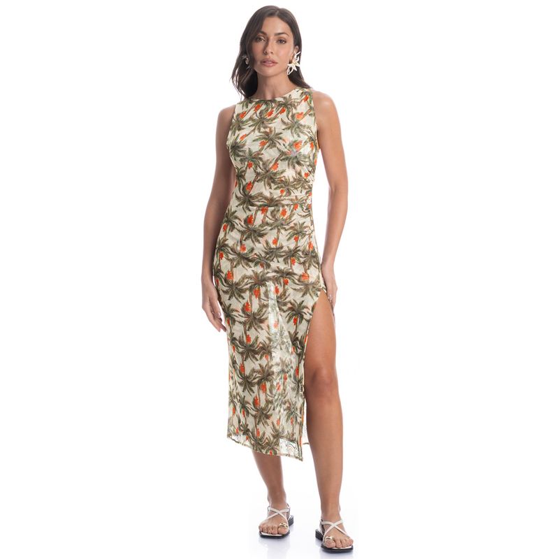 Vestido Midi Tule Franzido Coqueiros é estilo e tendência para seu verão! Em nova modelagem o Vestido Coqueiros possui comprimento midi, decote redondo e sua lateral da cintura conta com franzido que valoriza perfeitamente a silhueta. Sua saia possui fenda, garantido ainda mais estilo e deixando o vestido a cara do verão!
